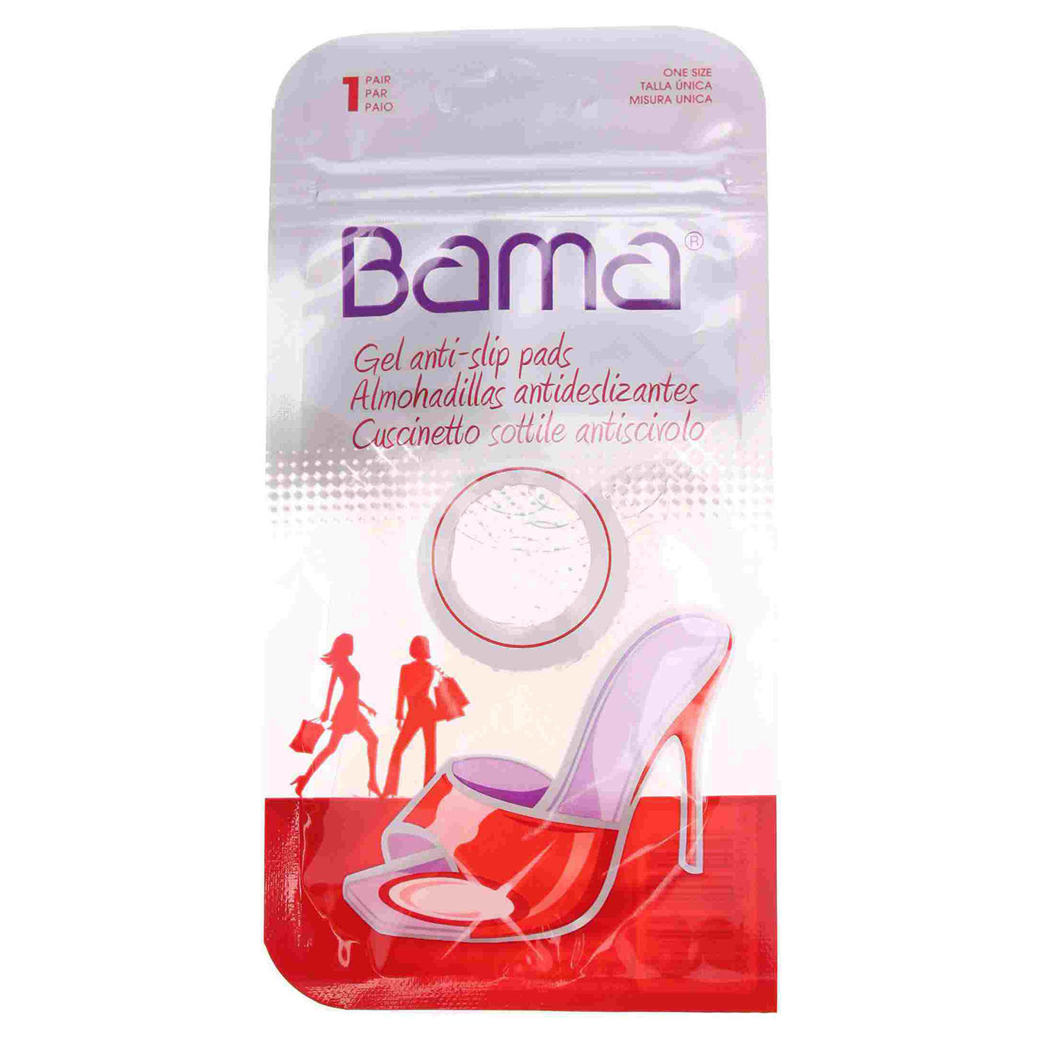 Bama - neviditelný gelový protiskluzový polštářek - brání klouzání nohou v obuvi. Polštářky jsou ideální do obuvi na vysokém podpatku nebo do sandálů. Univerzální velikost - hypoalergenní - dermatologicky textovány. Použití: stáhněte ochrannou folii na spodní straně, vložte do boty špičkou dopředu a přitlačte. Polštářek je možno po opláchnutí ve vlažné vodě (do 30°C) opakovaně použít i do jiné obuvi.