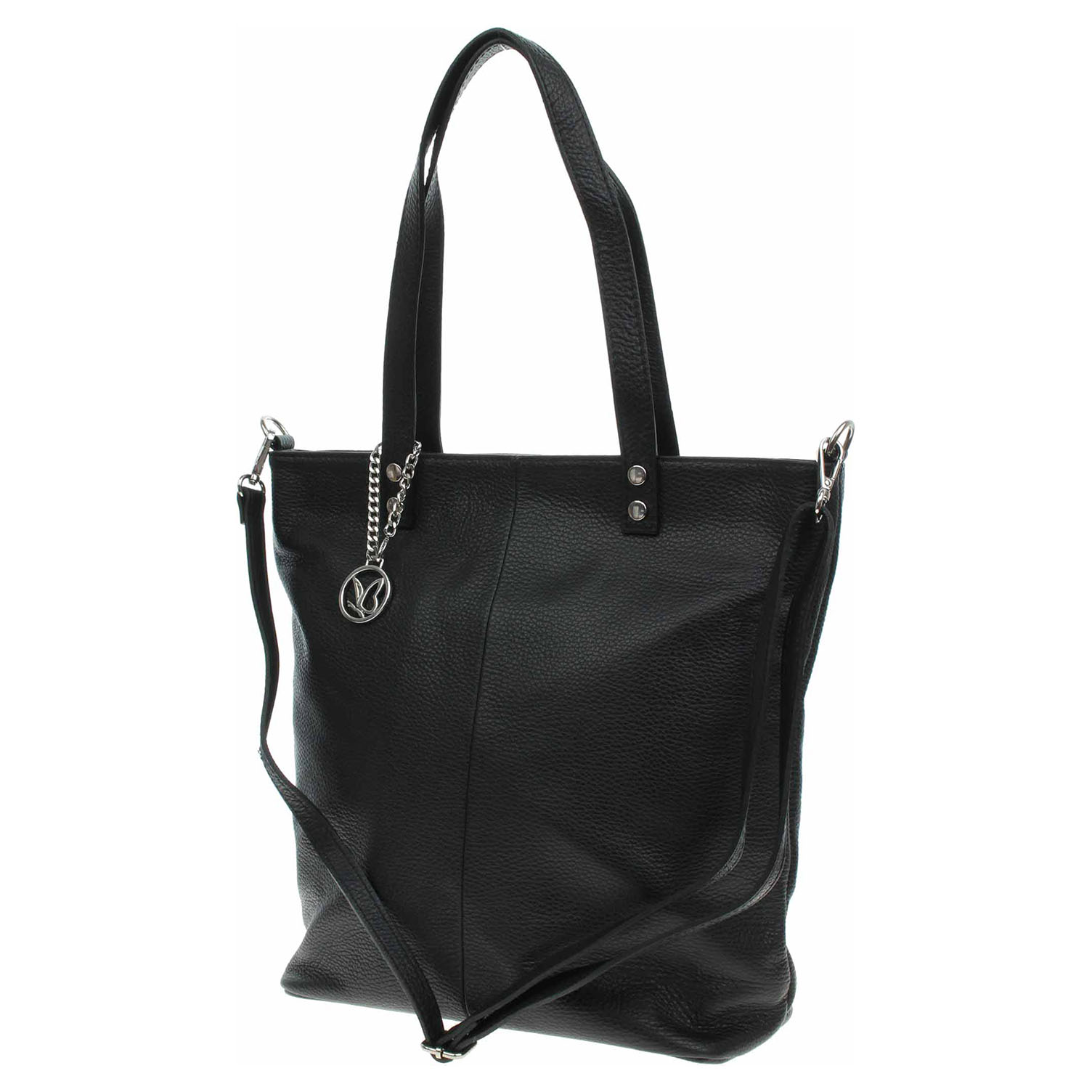 Caprice - dámská jednokomorová kabelka z usně a s podšívkou z polyesteru se zapíná na zip a má rozměry - 32 x 36 x 13 cm. Kabelku se stříbrným přívěškem je možno nosit v ruce za ucha (výška 22 cm) nebo na regulovatelném popruhu, který se dá odepnout, přes rameno. Vnitřní výbava: 1x kapsa se zipem.