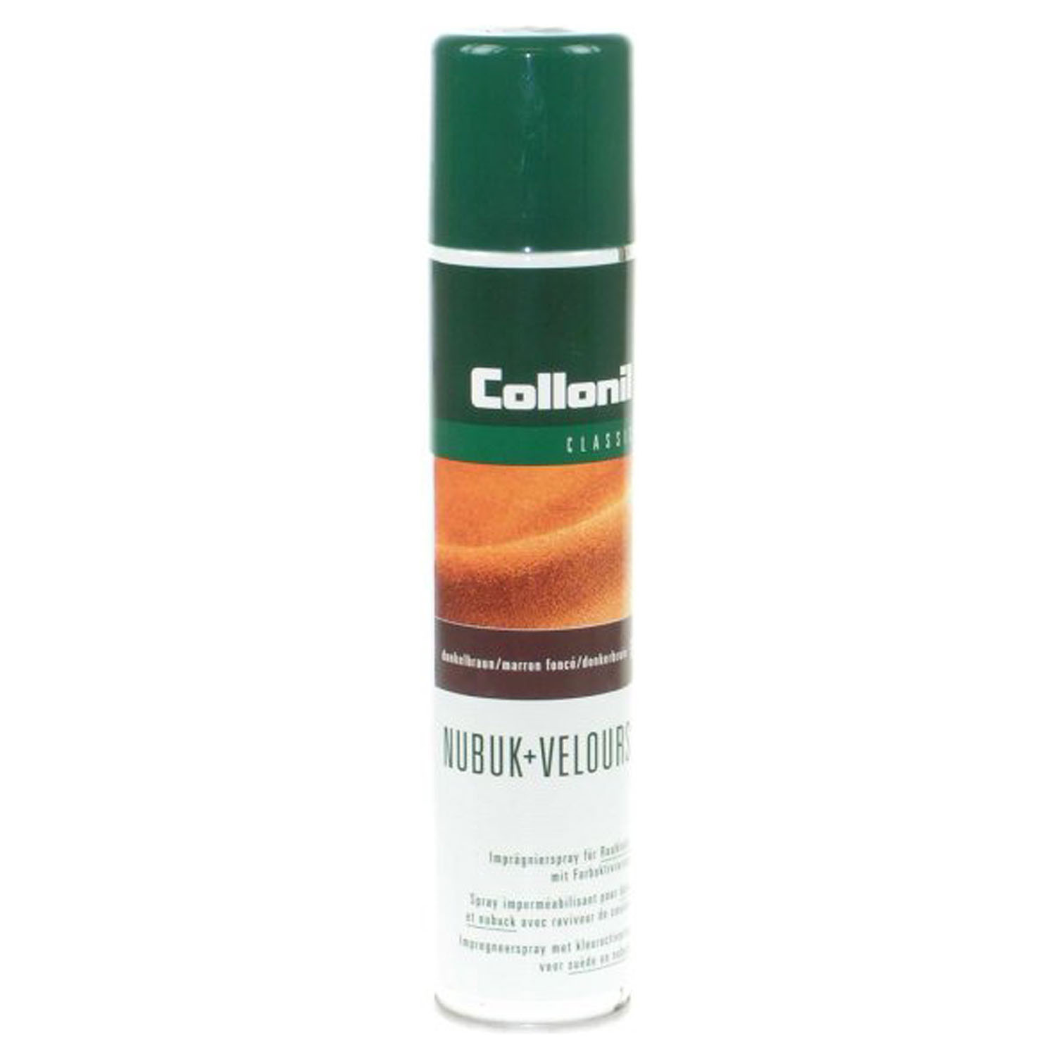 Collonil Nubuk + Velours - tmavě hnědý - 200 ml - prostředek na impregnaci a ošetřování výrobků ze semiše a nubuku. V barevném provedení impregnuje a zvlášť intenzivně oživuje barvy. Barevný sprej není vhodný pro kožené oděvy a galanterii. Nástřik provádíme ze vzdál. cca 20 cm a podle potřeby opakujeme. Po zaschnutí povrch obuvi vykartáčujeme krepovým kartáčkem. Vhodný i na textilní obuv. Možnost použití i na výrobky s GORE-TEXovou membránou.