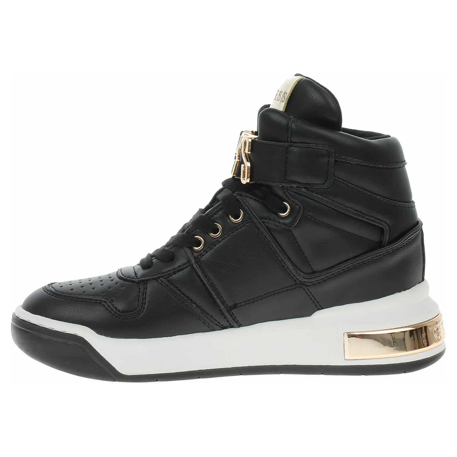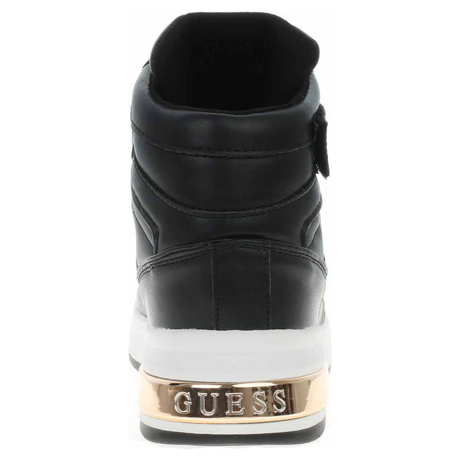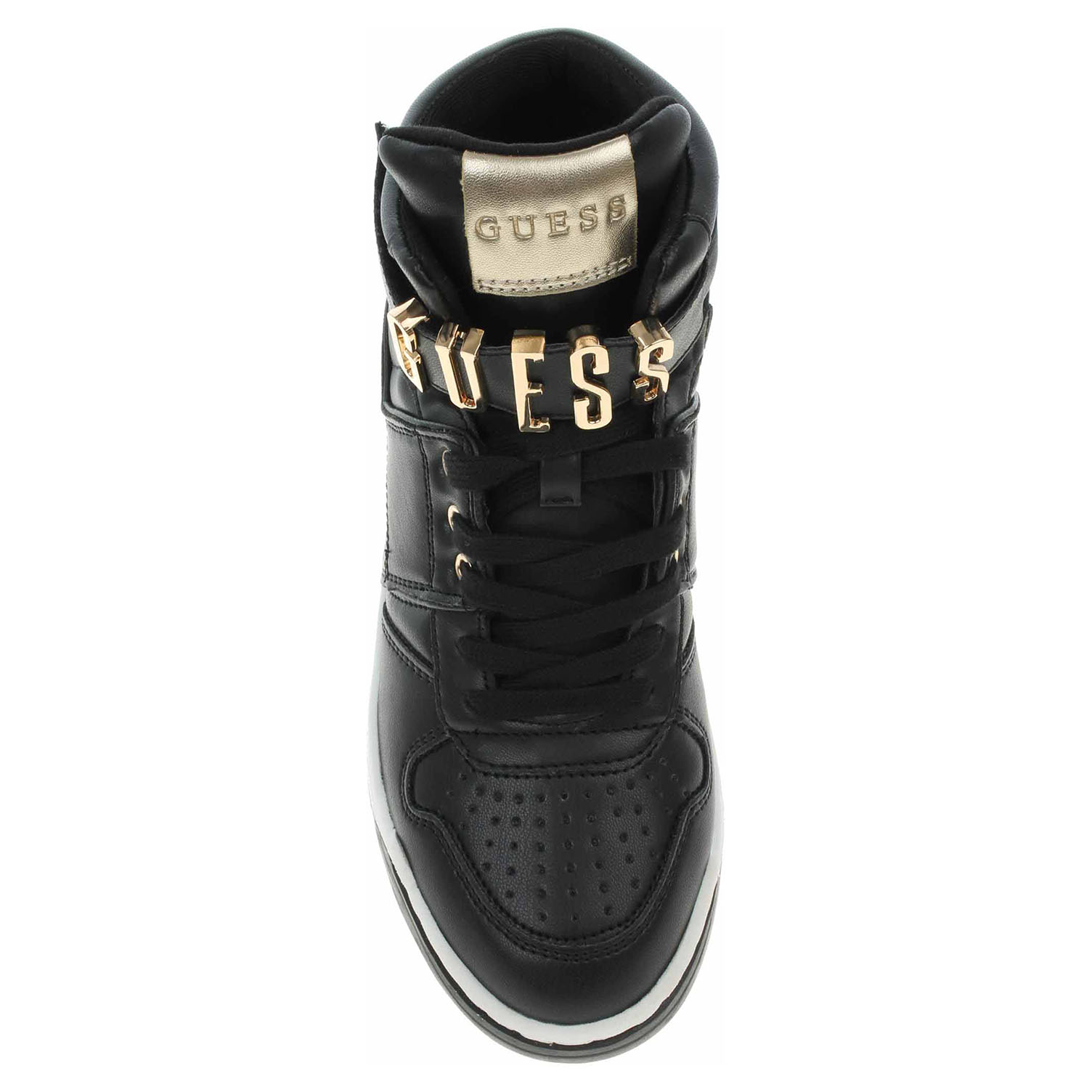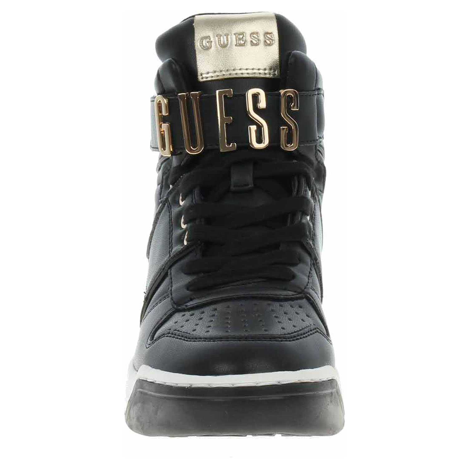 Boty Guess - lepená dámská kotníková obuv se svrškem ze syntetiky a s textilní podšívkou je vybavená vyndavací stélkou s nášlapnou vrstvou z usně. Vyměnitelné vložky do bot je možné vyndat za účelem provětrání a omytí. Pohodlné nazouvání zajišťuje šněrování a pásek s logem, který se zapíná na suchý zip. Klínek je vysoký 4,5 cm a platforma je vysoká 2,5 cm. Lepená obuv - pevnost lepeného spoje může být negativně ovlivněna promáčením nebo propocením, event. opakovaným používáním nedostatečně vysušené obuvi. Při neopatrné chůzi může dojít k mechanickému uvolnění lepeného spoje - ukopnutí.