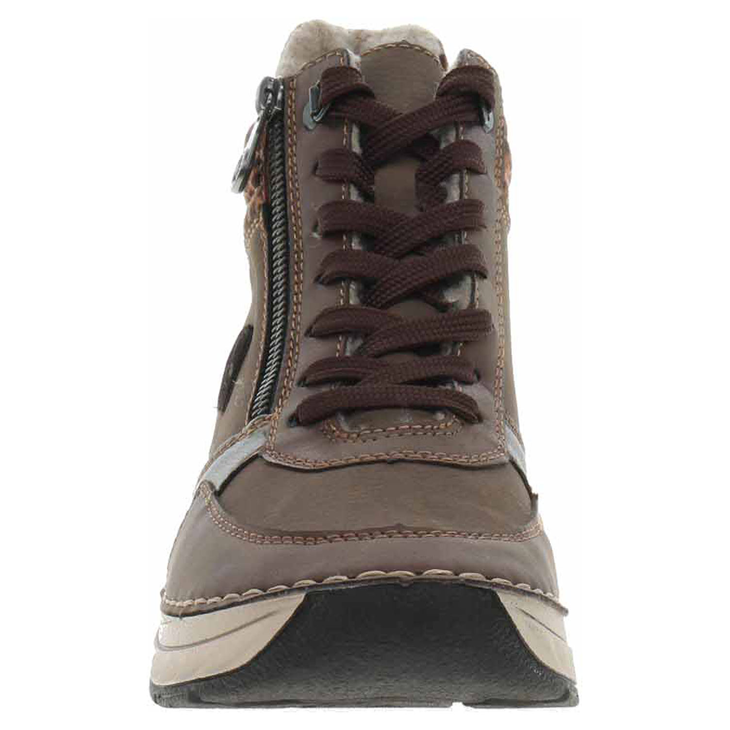 Boty Rieker - flexiblová dámská kotníková obuv nadměrné šíře H se svrškem ze syntetiky a s textilní, vyměkčenou stélkou je vyteplená textilní podšívkou s chlupem. Pohodlné nazouvání zajišťuje zip na vnější straně a šněrování na nártu. Klínek se vzduchovým polštářem je vysoký 3,5 cm a platforma je vysoká 2,5 cm. Podešev je flexibilní a díky systému Antistress (lehkost, pružnost, prostornost a vynikající absorpce nárazů) Vám obuv zajistí pohodlí při každém kroku. Flexiblová obuv - prošívaná podešev, obuv používejte v suchém prostředí. Při zvýšené vlhkosti může dojít k promáčení obuvi. Obuv pravidelně impregnujte nebo krémujte, zvláště pak prošívaný okraj.