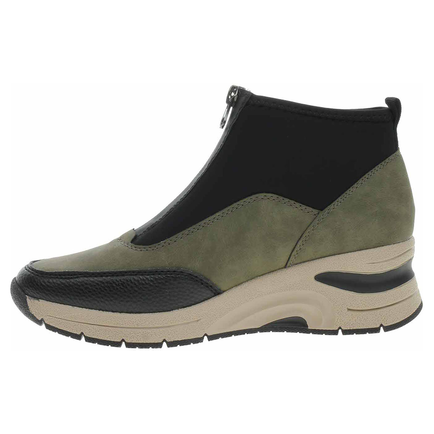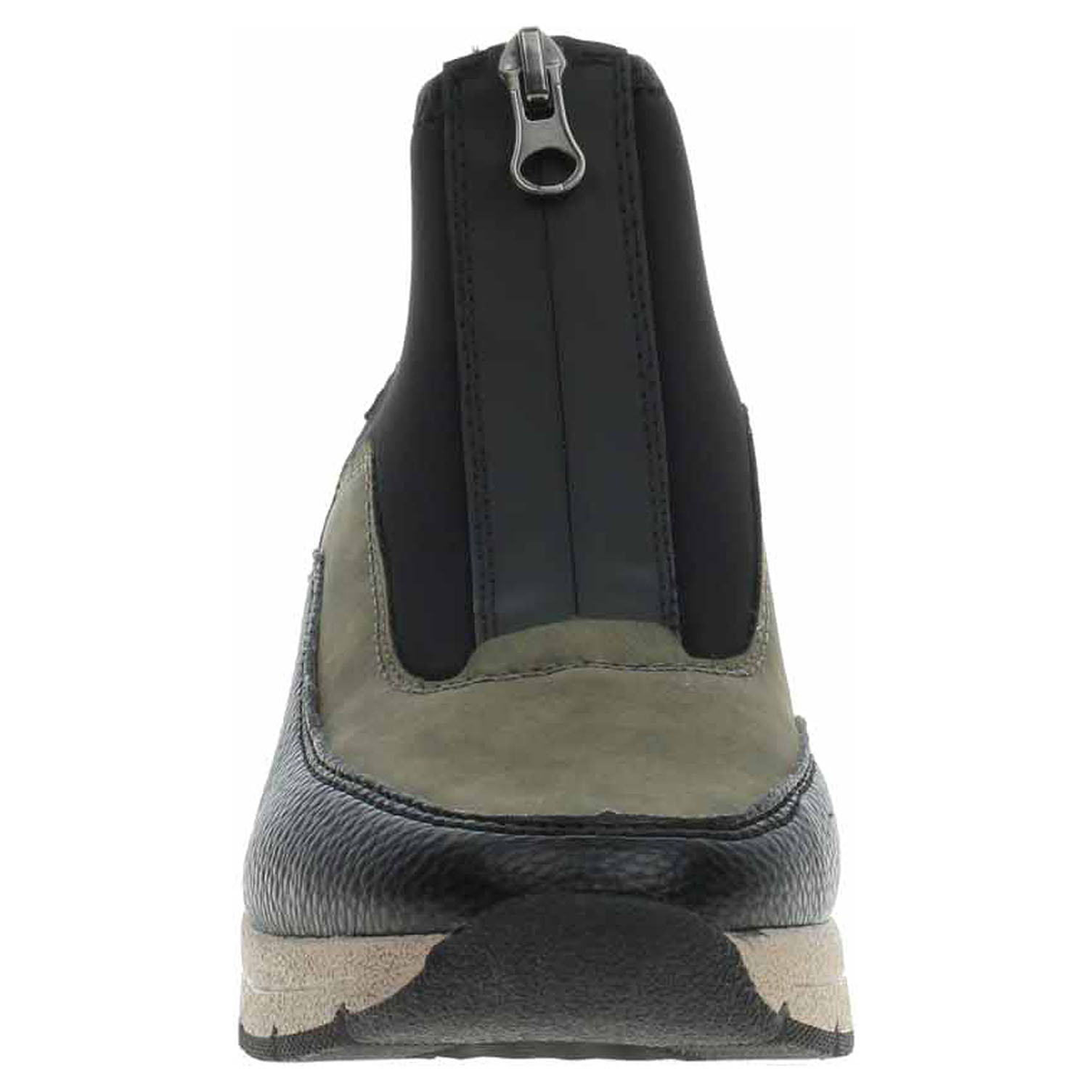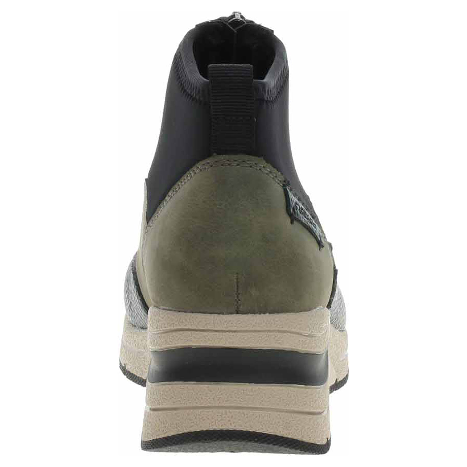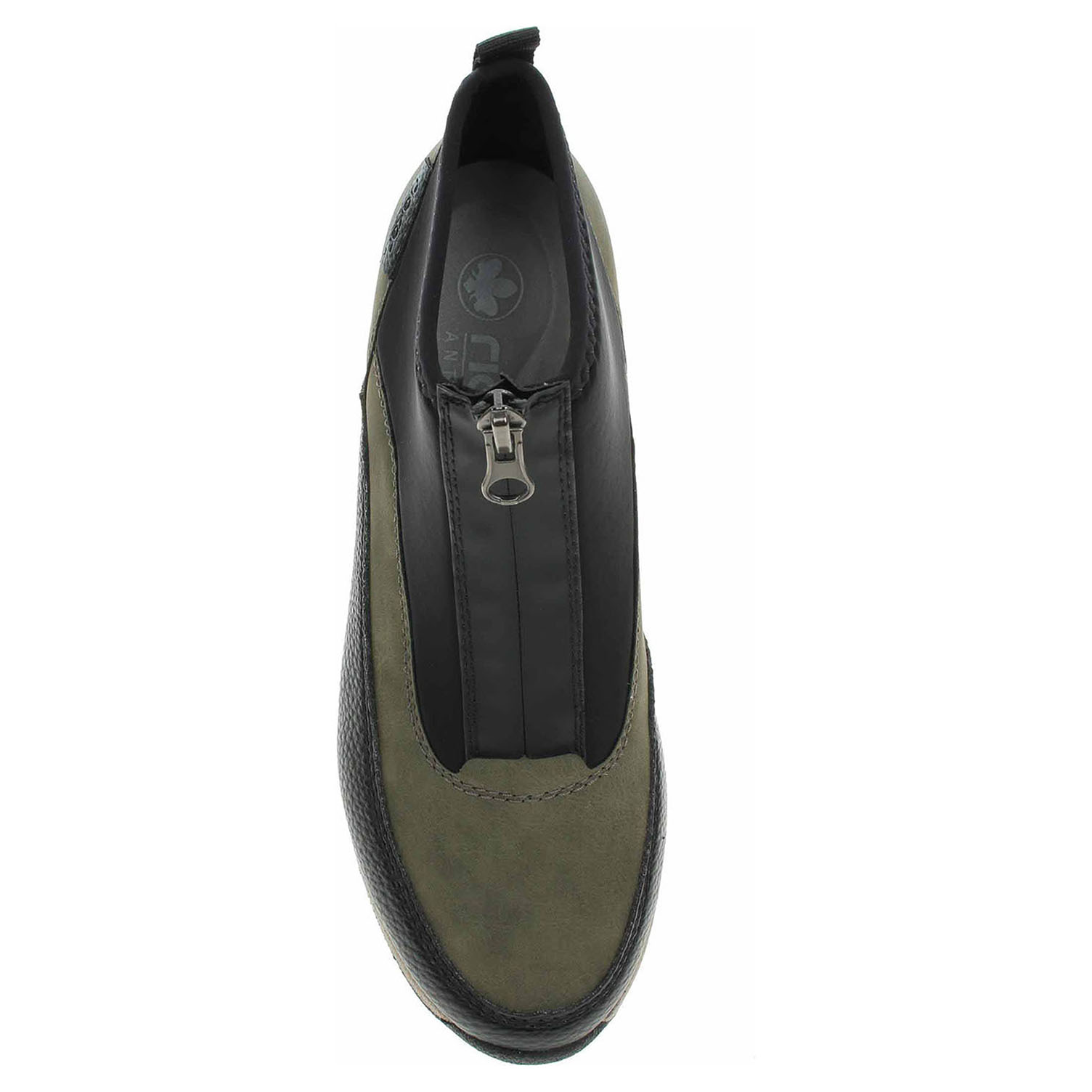 Boty Rieker - lepená dámská kotníková obuv se svrškem kombinovaným syntetika/textil a s textilní stélkou je na nártu vybavená plně funkčním zipem, který zajišťuje pohodlné nazouvání. Vyměnitelné vložky do bot je možné vyndat za účelem provětrání a omytí. Značnou výhodu nabízejí vyměnitelné vložky do bot také těm uživatelům, kteří používají ortopedické vkládací stélky. Klínek je vysoký 5,- cm a platforma je vysoká 2,- cm. Podešev je flexibilní a díky systému Antistress skvěle tlumí nárazy a otřesy. Lepená obuv - pevnost lepeného spoje může být negativně ovlivněna promáčením nebo propocením, event. opakovaným používáním nedostatečně vysušené obuvi. Při neopatrné chůzi může dojít k mechanickému uvolnění lepeného spoje - ukopnutí.