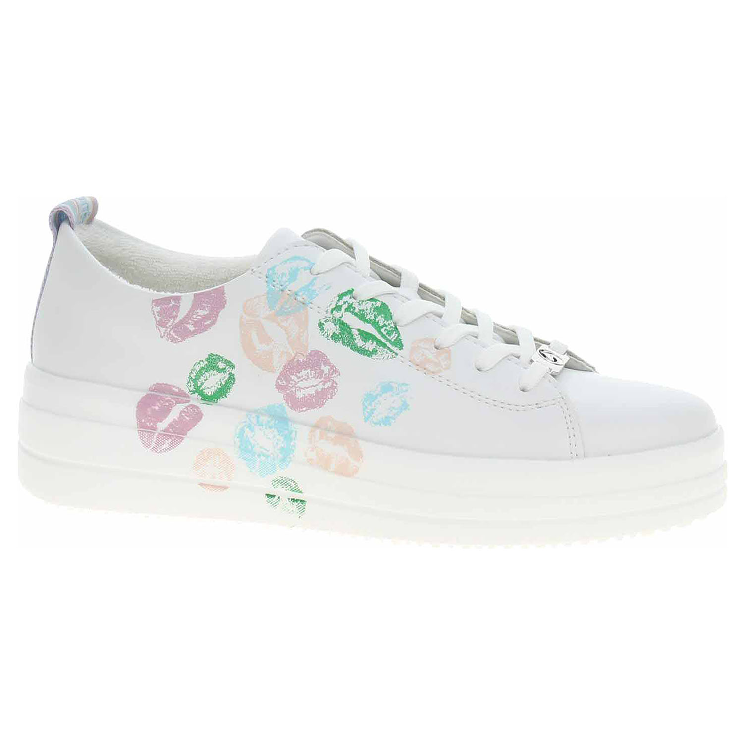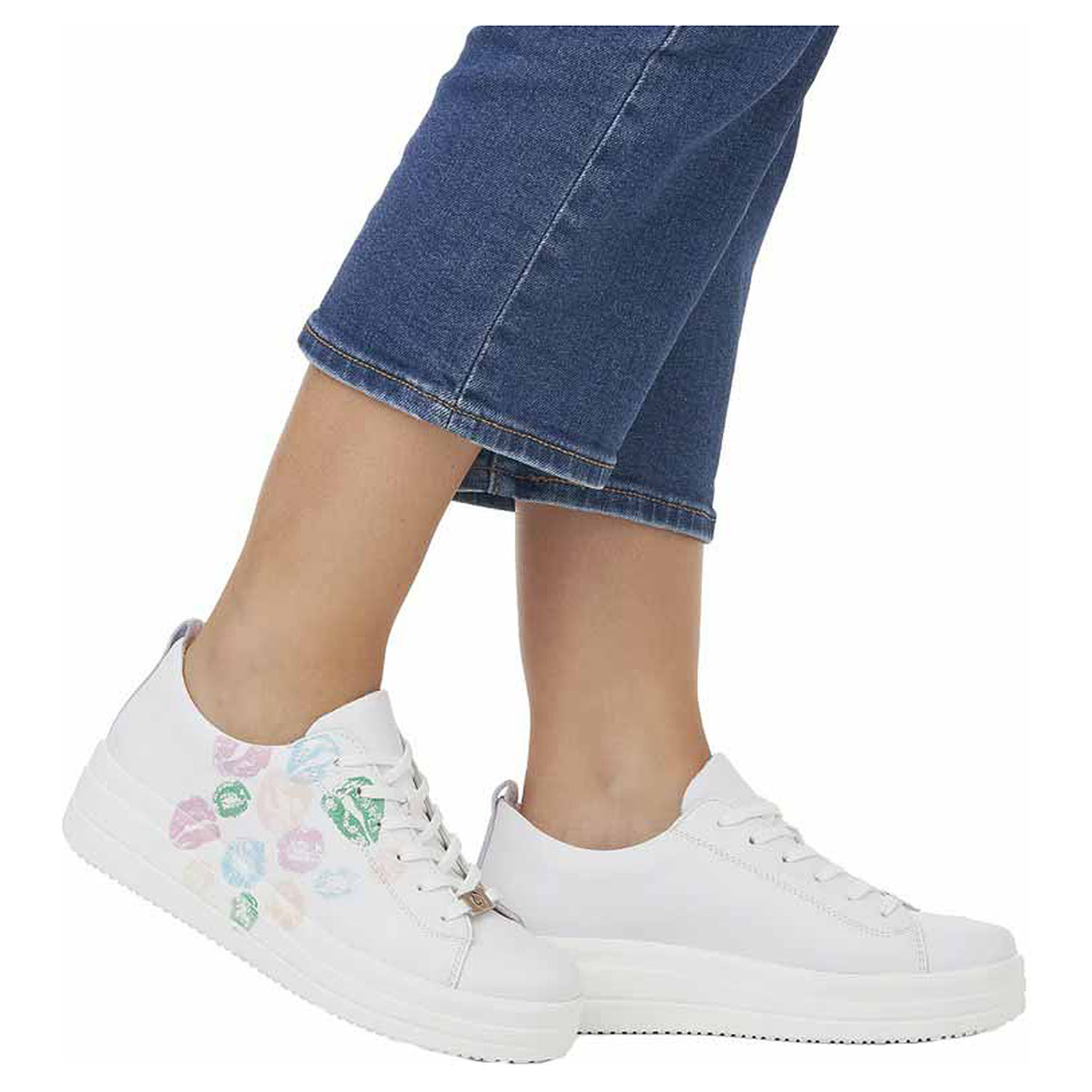 Boty Remonte - Lite´n Soft- lepená dámská vycházková obuv se šněrováním má svršek ze syntetiky (vyzdobený barevným potiskem rtů), textilní podšívku a je vybavená tvarovanou, vyndavací stélkou s textilní nášlapnou vrstvou, která zajišťuje podporu klenby. Vyměkčené vložky do bot je možné vyndat za účelem provětrání a omytí. Značnou výhodu nabízejí vyměnitelné vložky do bot také těm uživatelům, kteří používají ortopedické vkládací stélky. Lite´n Soft = chůze jak v oblacích - ultra lehká a protiskluzová podešev + velmi příjemné materiály + extra měkká komfortní stélka. Klínek je vysoký 4,5 cm a platforma je vysoká 2,5 cm. Obuv je 100% VEGAN = při výrobě obuvi nebyly použity žádné materiály ze zvířat. Lepená obuv - pevnost lepeného spoje může být negativně ovlivněna promáčením nebo propocením, event. opakovaným používáním nedostatečně vysušené obuvi. Při neopatrné chůzi může dojít k mechanickému uvolnění lepeného spoje - ukopnutí.