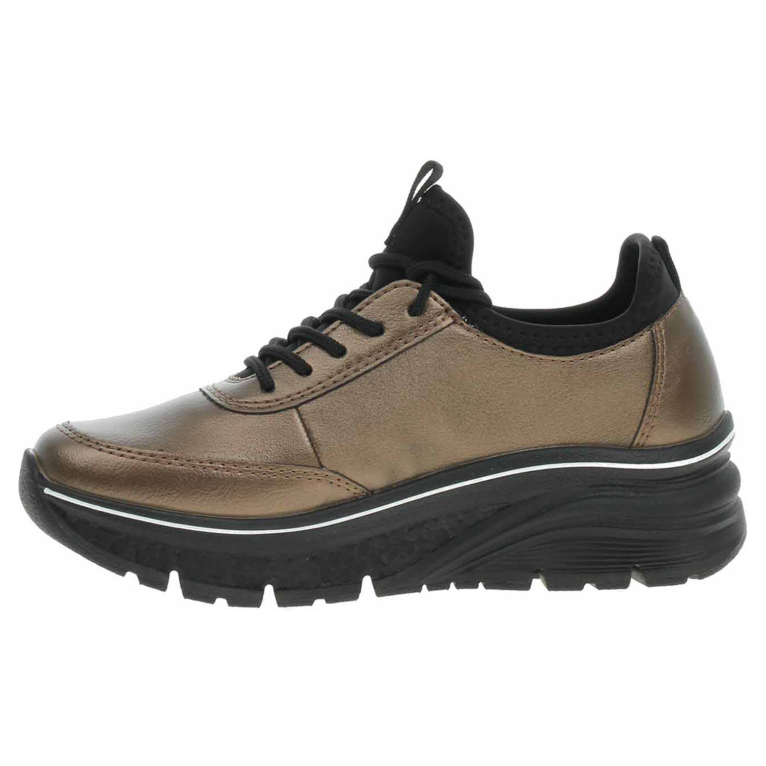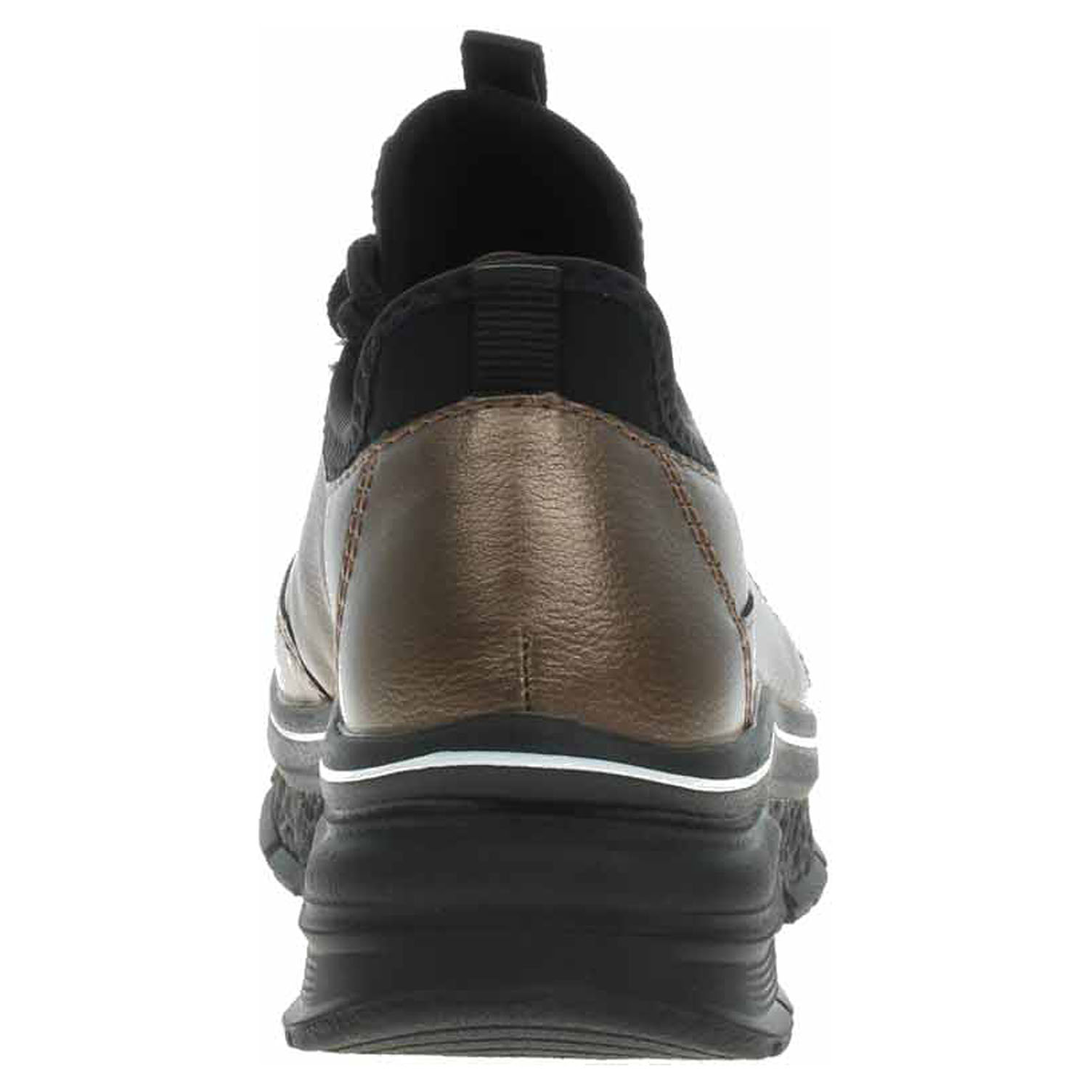 Boty Rieker - lepená dámská vycházková obuv se svrškem v bronzové barvě kombinovaným syntetika/textil a s textilní podšívkou je vybavená ultralehkou podešví Rieker-Lite a paměťovou stélkou MemoSoft, která maximálně změkčuje došlap a zvyšuje pohodlí v obuvi. Pohodlné nazouvání zajišťuje textilní ponožkový nástup do obuvi. Klínek je vysoký 4,- cm a platrforma je vysoká 2,5 cm. Lepená obuv - pevnost lepeného spoje může být negativně ovlivněna promáčením nebo propocením, event. opakovaným používáním nedostatečně vysušené obuvi. Při neopatrné chůzi může dojít k mechanickému uvolnění lepeného spoje - ukopnutí.