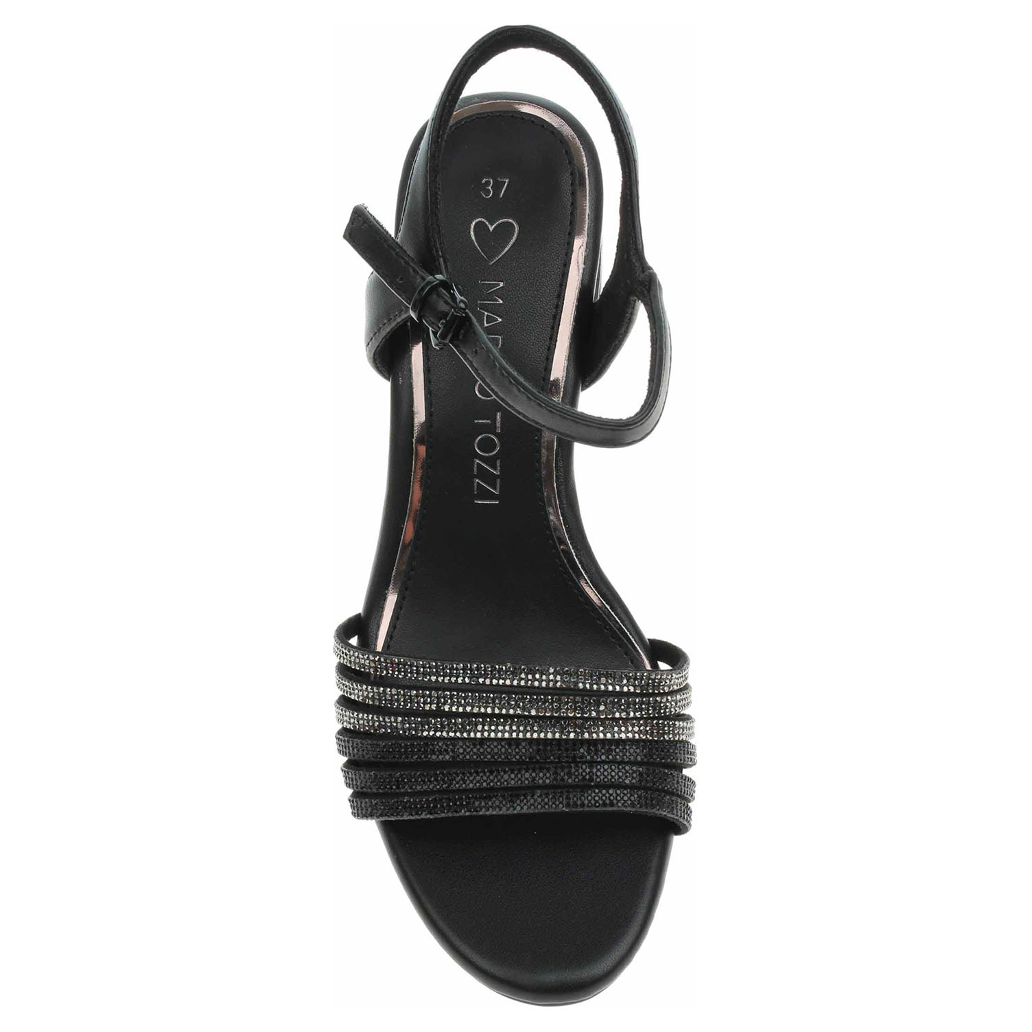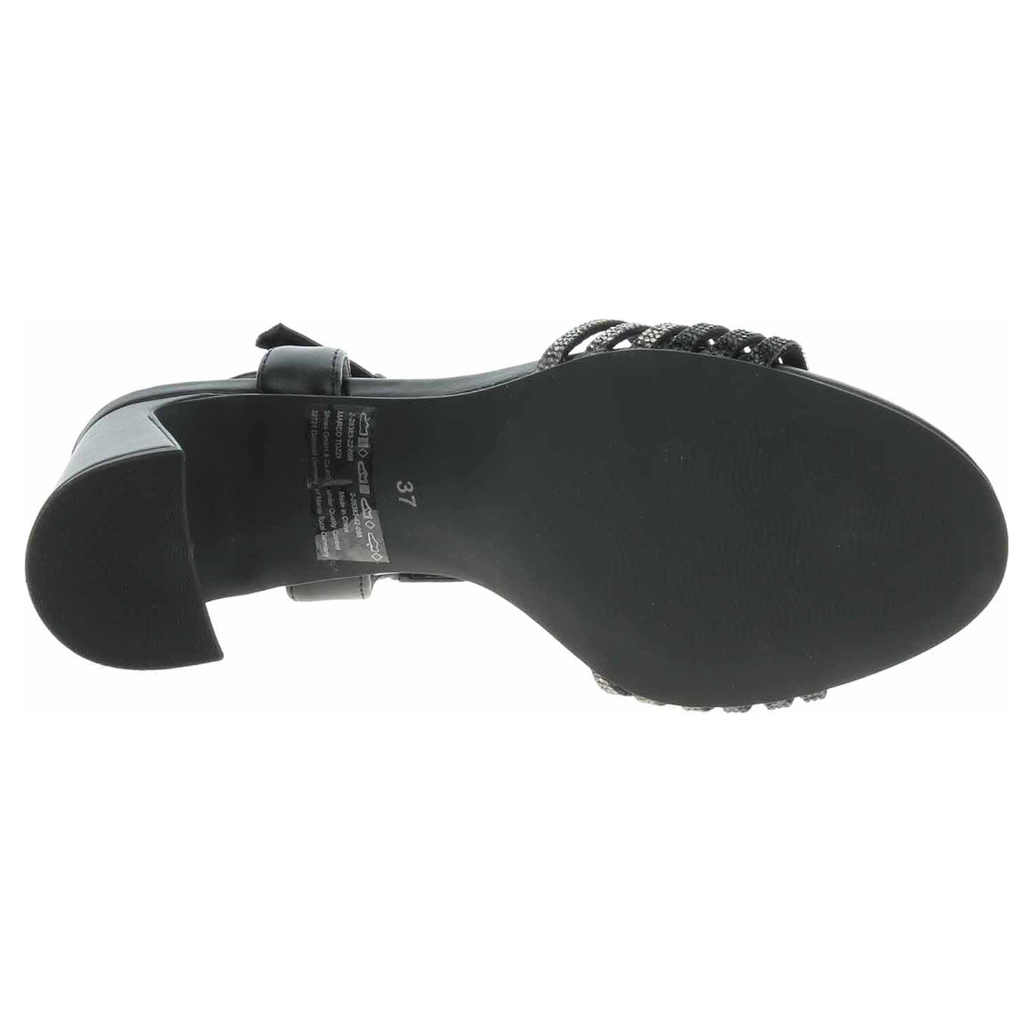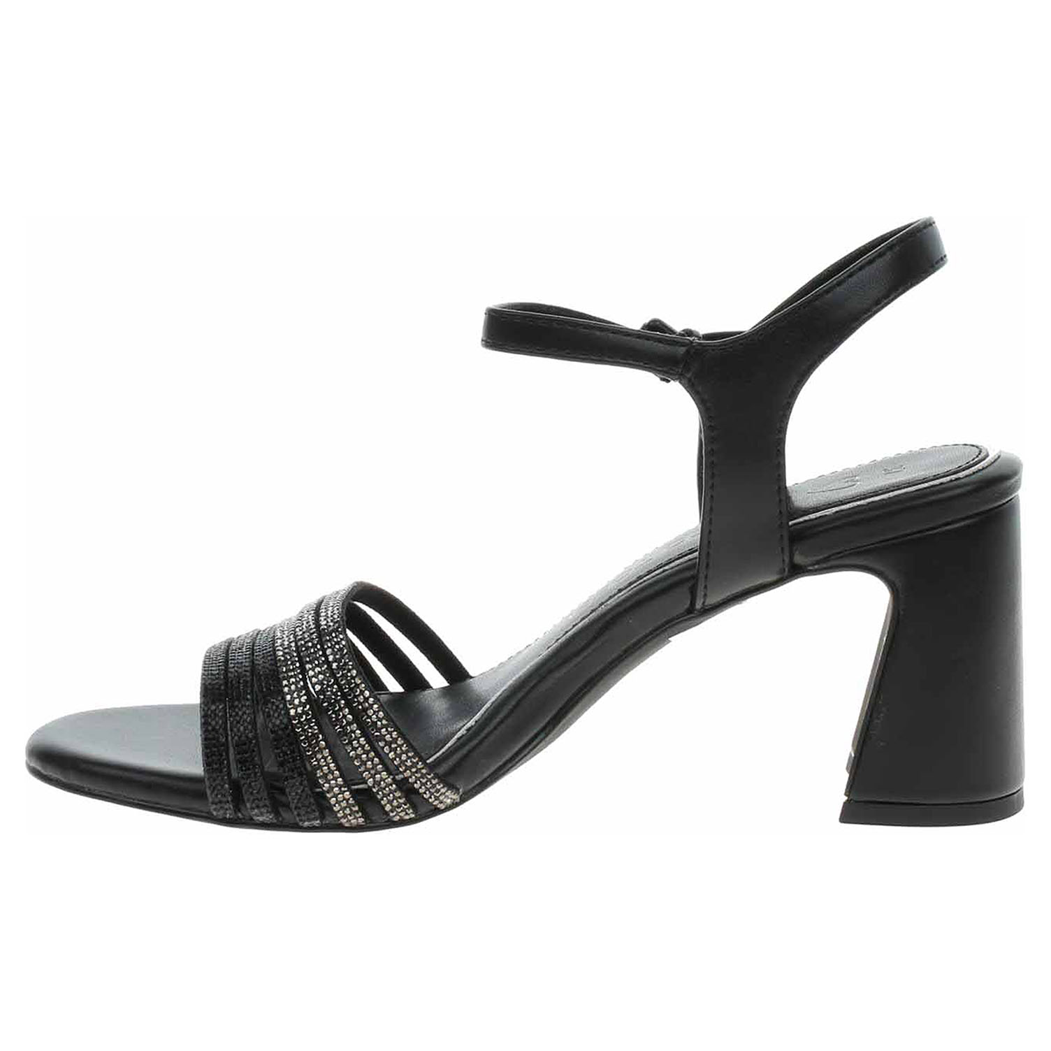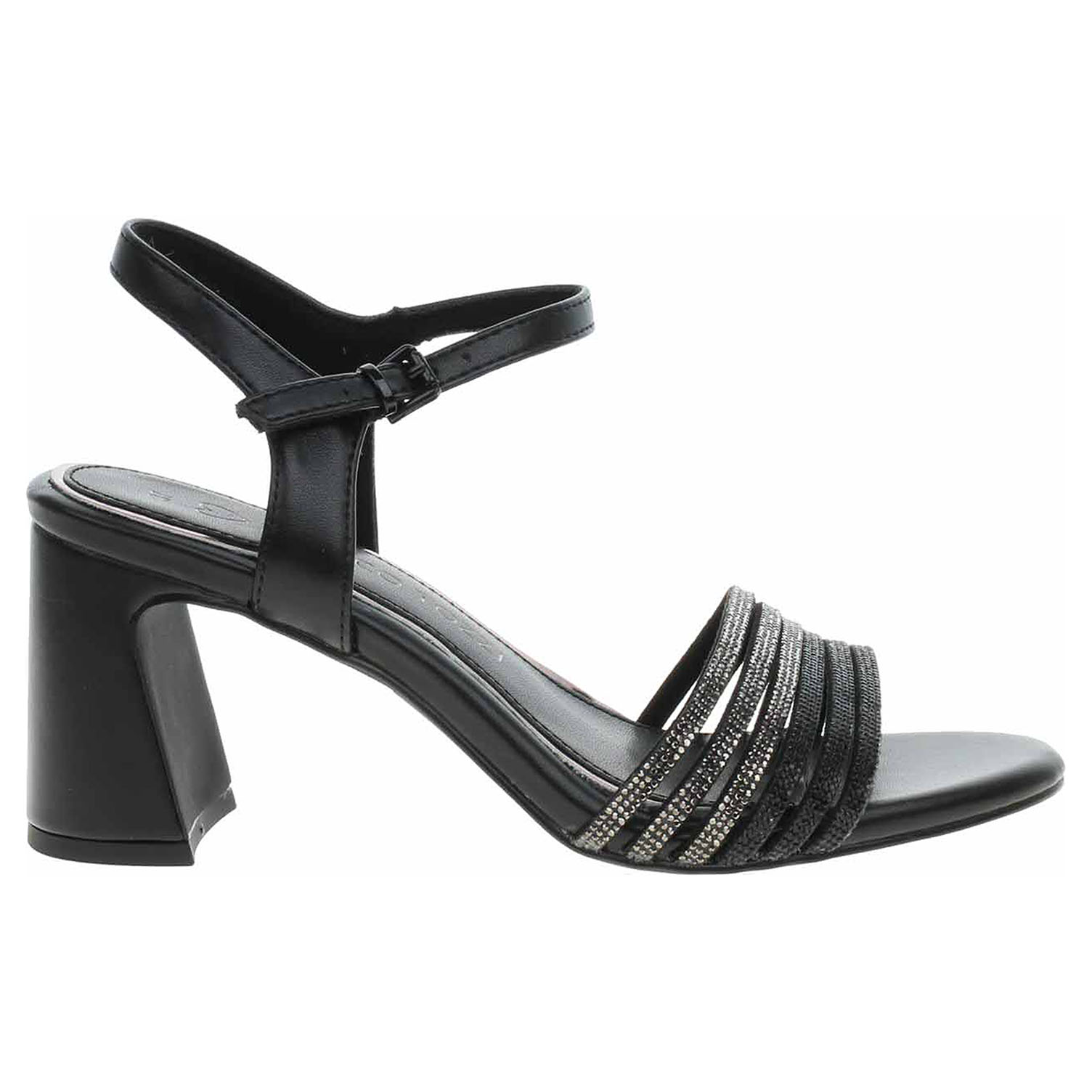 Boty Marco Tozzi - společenské dámské sandály se svrškem kombinovaným syntetika/textil a s textilní podšívkou jsou vybavené vyměkčenou stélkou Feel me s nášlapnou vrtvou ze syntetiky, která se přizpůsobuje vašemu chodidlu a zajišťuje optimální komfort při chůzi. Pásek přes kotník se zapíná na přezku. Podpatek je vysoký 8,- cm. Obuv je 100% VEGAN = při výrobě obuvi nebyly použity žádné materiály ze zvířat. Společenská obuv - vhodná ke krátkodobému nošení v interiérech. Obuv nevystavujte vlhkosti.