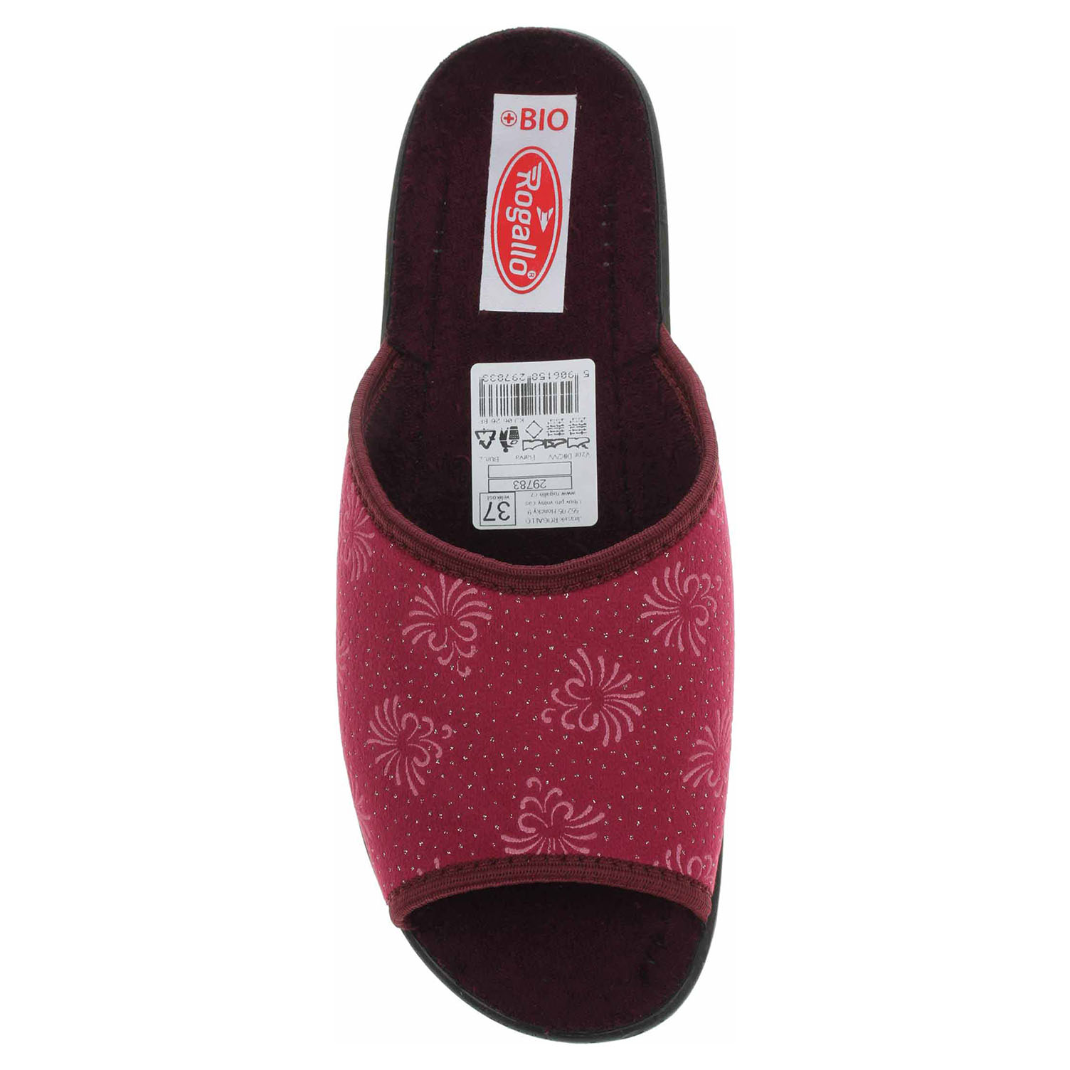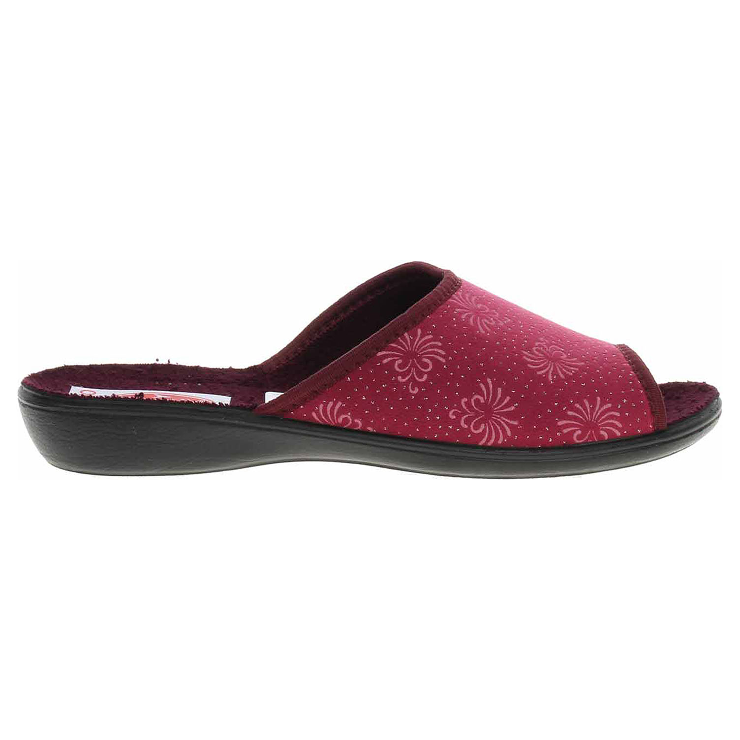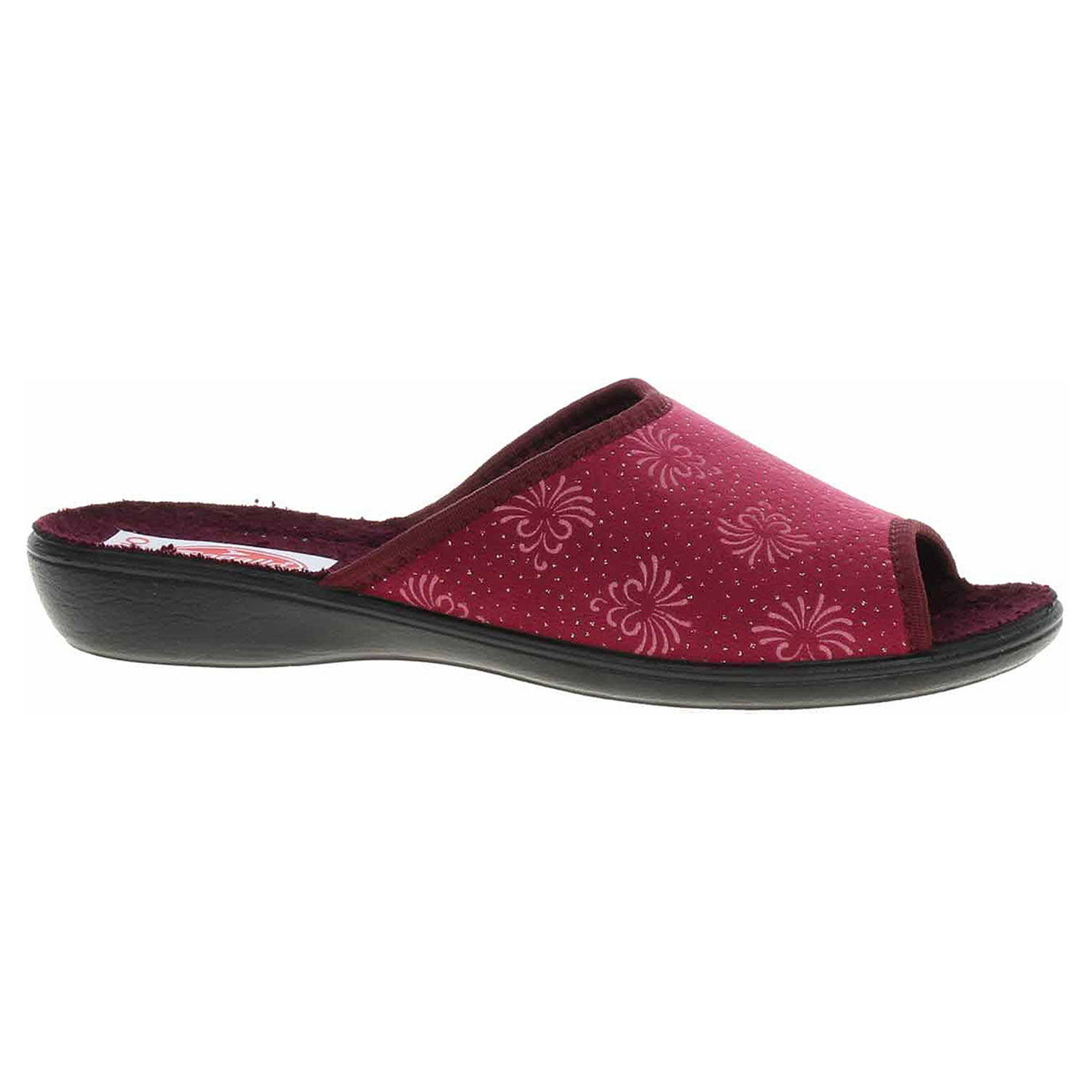 Boty Rogallo - dámské domácí pantofle s otevřenou špičkou na klínku vysokém 2,- cm. Svršek, podšívka i stélka jsou textilní.