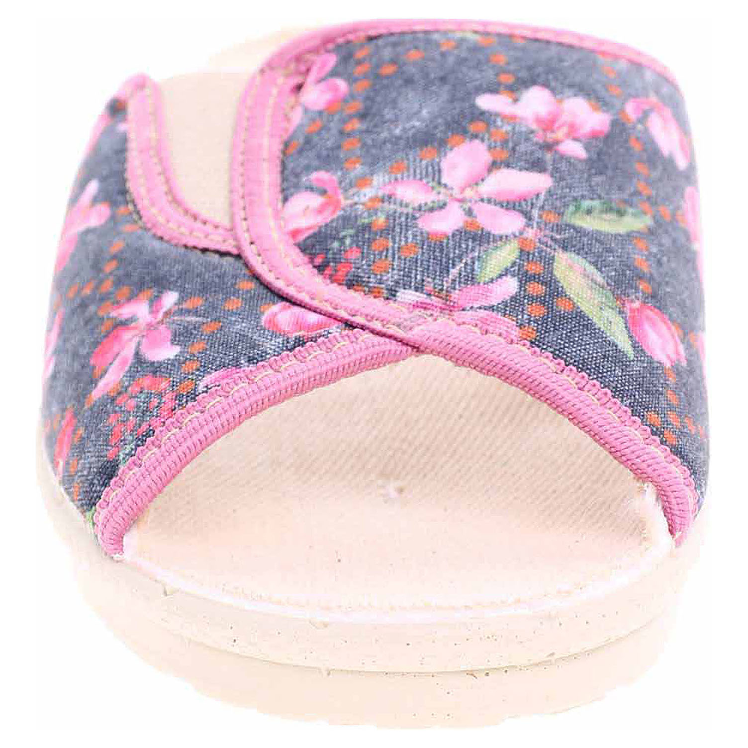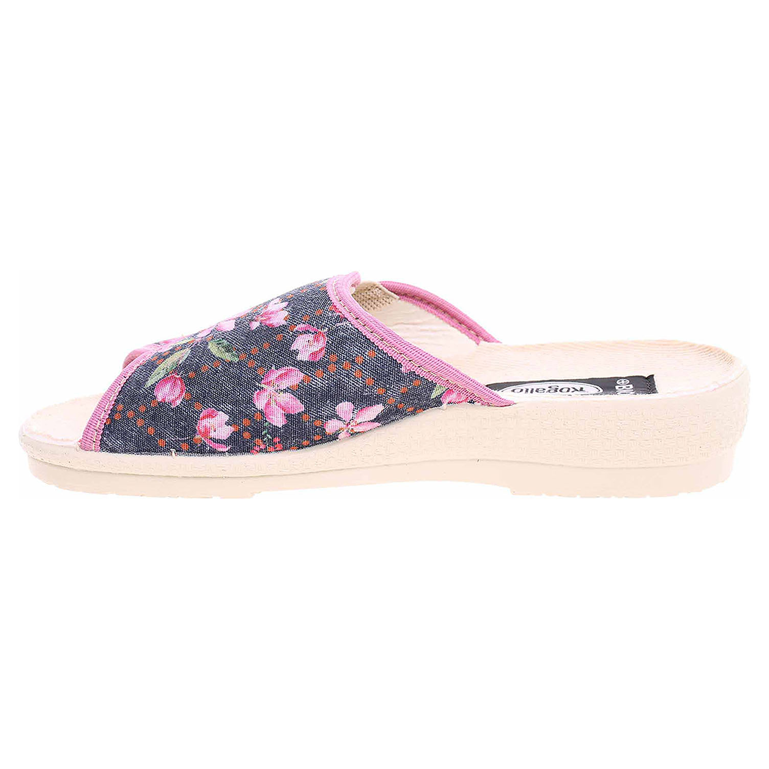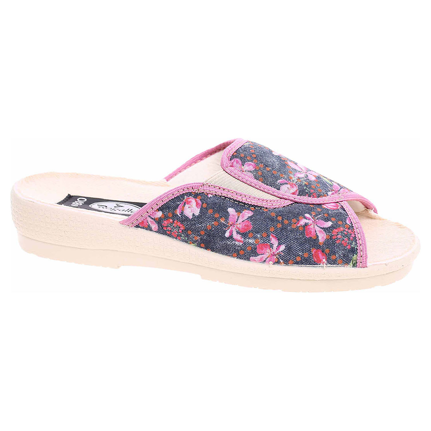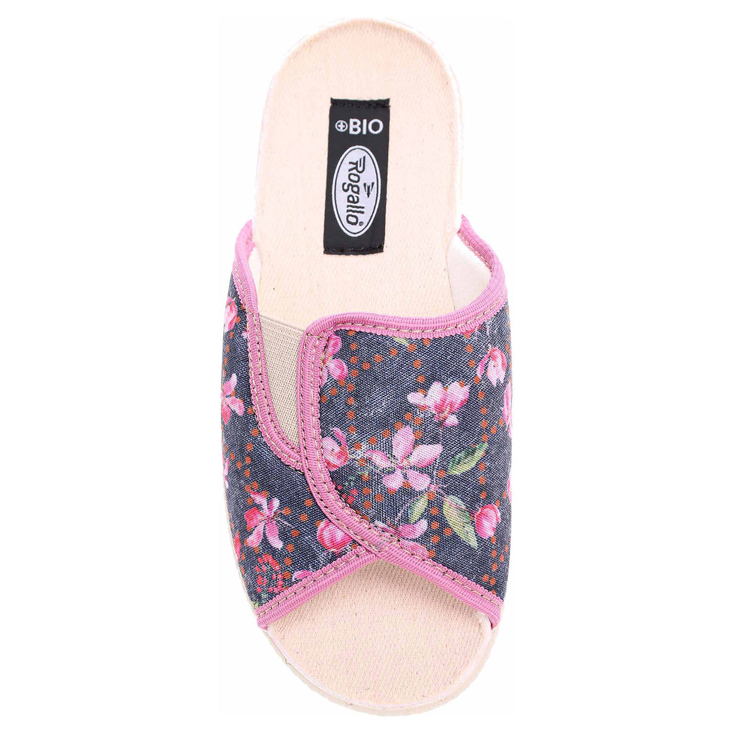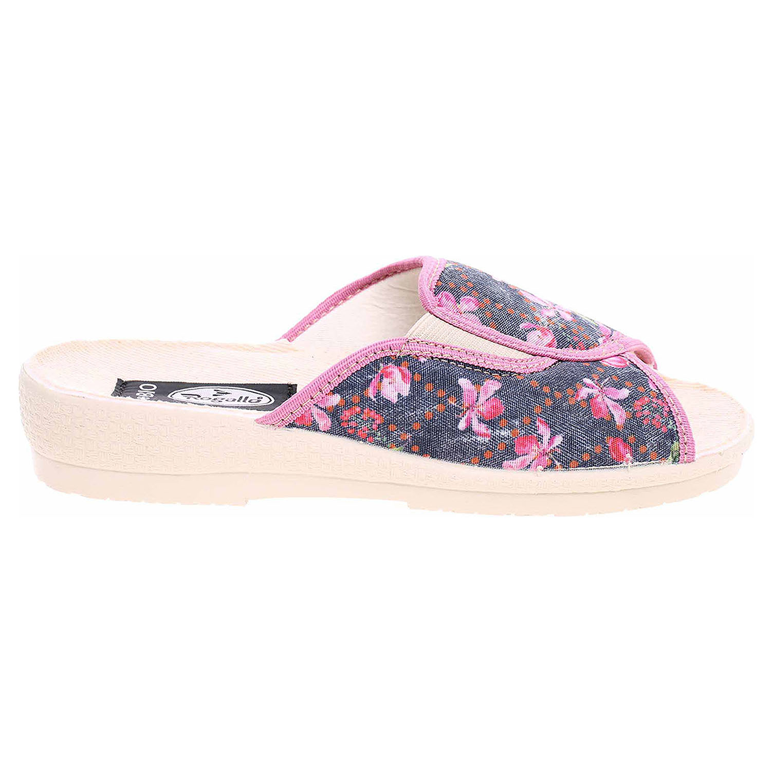 Boty Rogallo - dámské domácí pantofle s otevřenou špičkou na klínku vysokém 3,- cm. Svršek, podšívka i stélka obuvi jsou textilní.