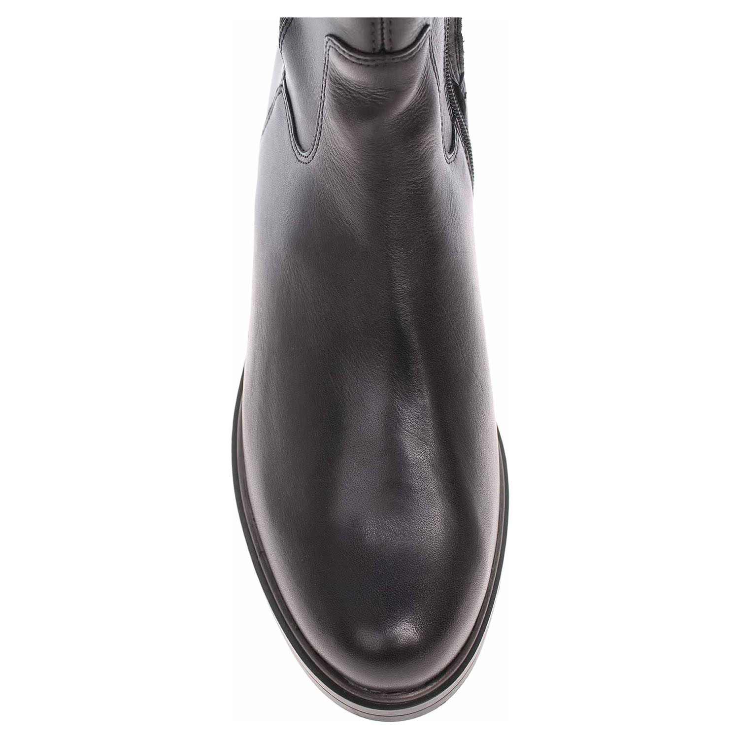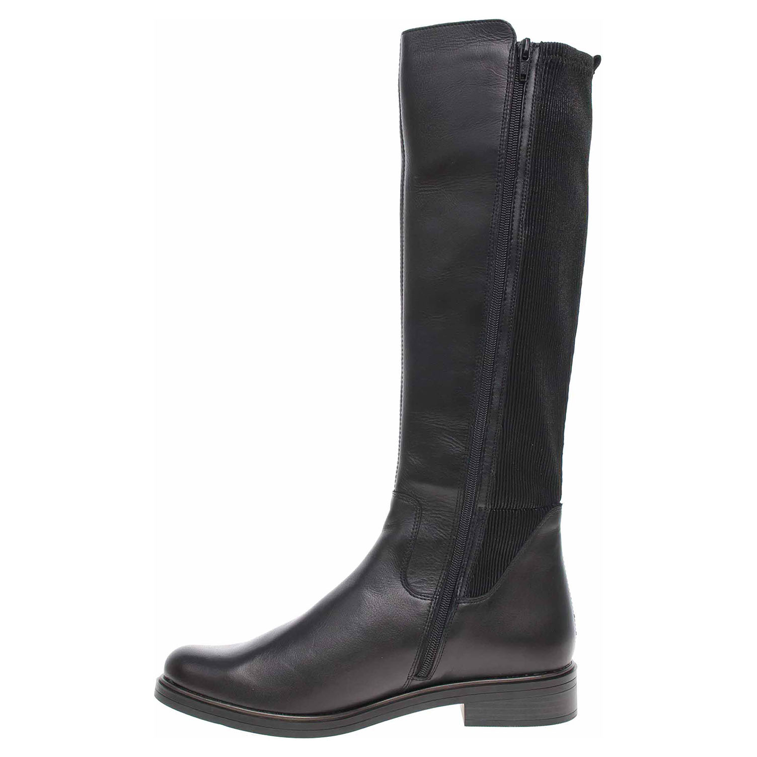 Boty Remonte - lepené dámské kozačky vhodné pro středně široké lýtko velikosti M jsou vybavené zipem a Vario systémem (strečový materiál po celé výšce lýtka), který umožňuje částečné zvětšení objemu a přizpůsobení se tvaru lýtka. Svršek je kombinovaný useň/textil. Obuv je vyteplená textilní podšívkou s jemným chloupkem. Podpatek je vysoký 3,- cm. Lepená obuv - pevnost lepeného spoje může být negativně ovlivněna promáčením nebo propocením, event. opakovaným používáním nedostatečně vysušené obuvi. Při neopatrné chůzi může dojít k mechanickému uvolnění lepeného spoje - ukopnutí.