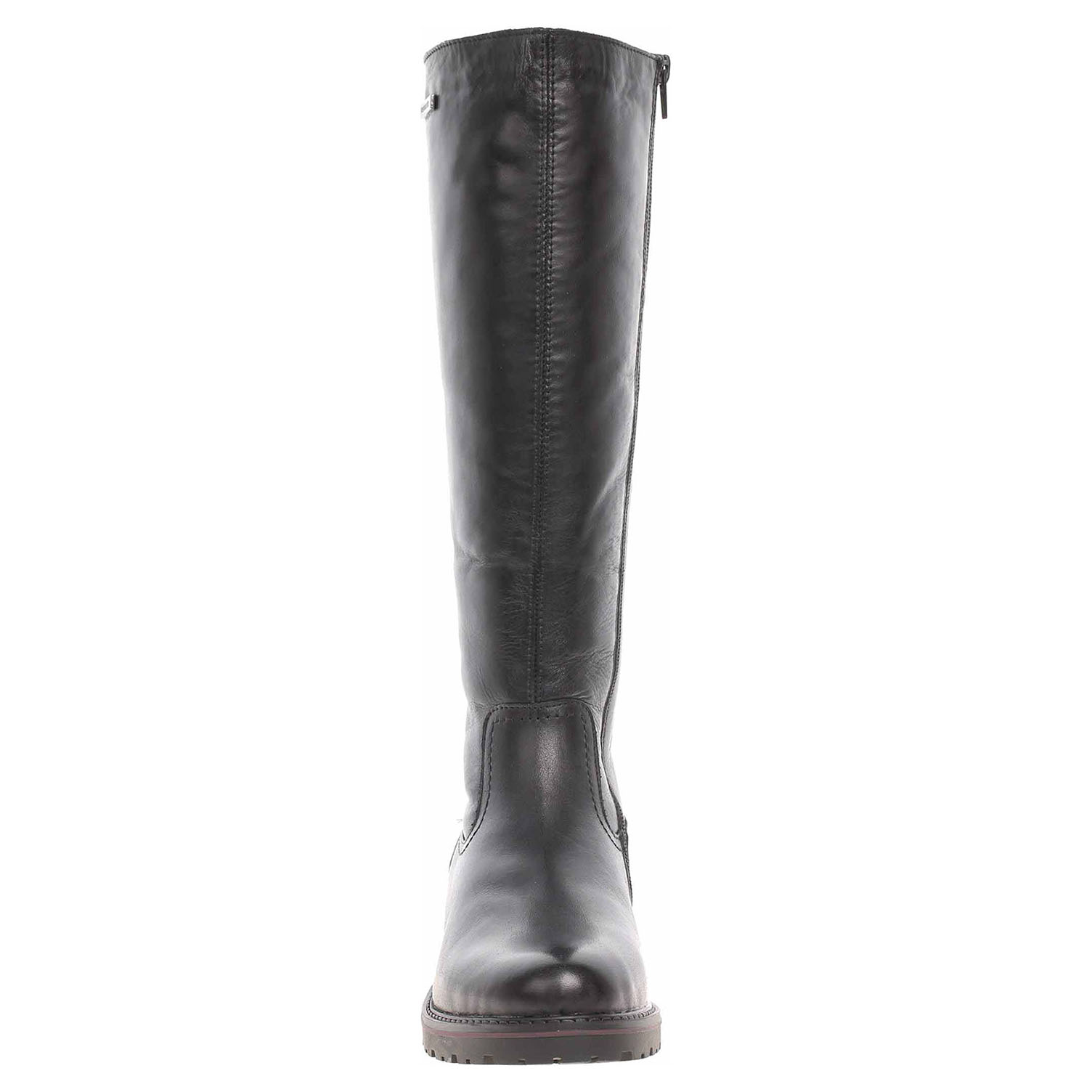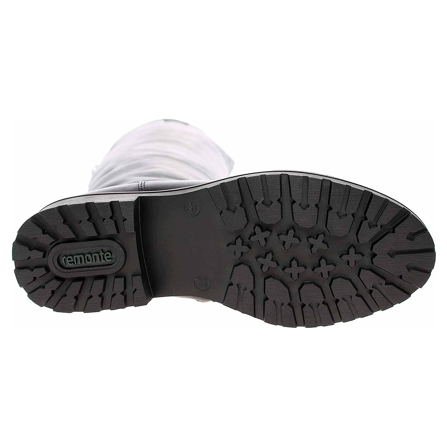 Boty Remonte - lepené dámské kozačky se svrškem z usně a s podšívkou ze střižní ovčí vlny jsou vhodné pro středně široké lýtko velikosti M. Obuv je vybavená zipem a vsazenou gumičkou na vnitřní straně, vyndavací stélkou a Vario systémem (zip po celé výšce lýtka), který umožňuje částečné zvětšení objemu a přizpůsobení se tvaru lýtka. Vyměnitelné vložky do bot je možné vyndat za účelem provětrání a omytí. Značnou výhodu nabízejí vyměnitelné vložky do bot také těm uživatelům, kteří používají ortopedické vkládací stélky. Podpatek je vysoký 3,- cm. Lepená obuv - pevnost lepeného spoje může být negativně ovlivněna promáčením nebo propocením, event. opakovaným používáním nedostatečně vysušené obuvi. Při neopatrné chůzi může dojít k mechanickému uvolnění lepeného spoje - ukopnutí.