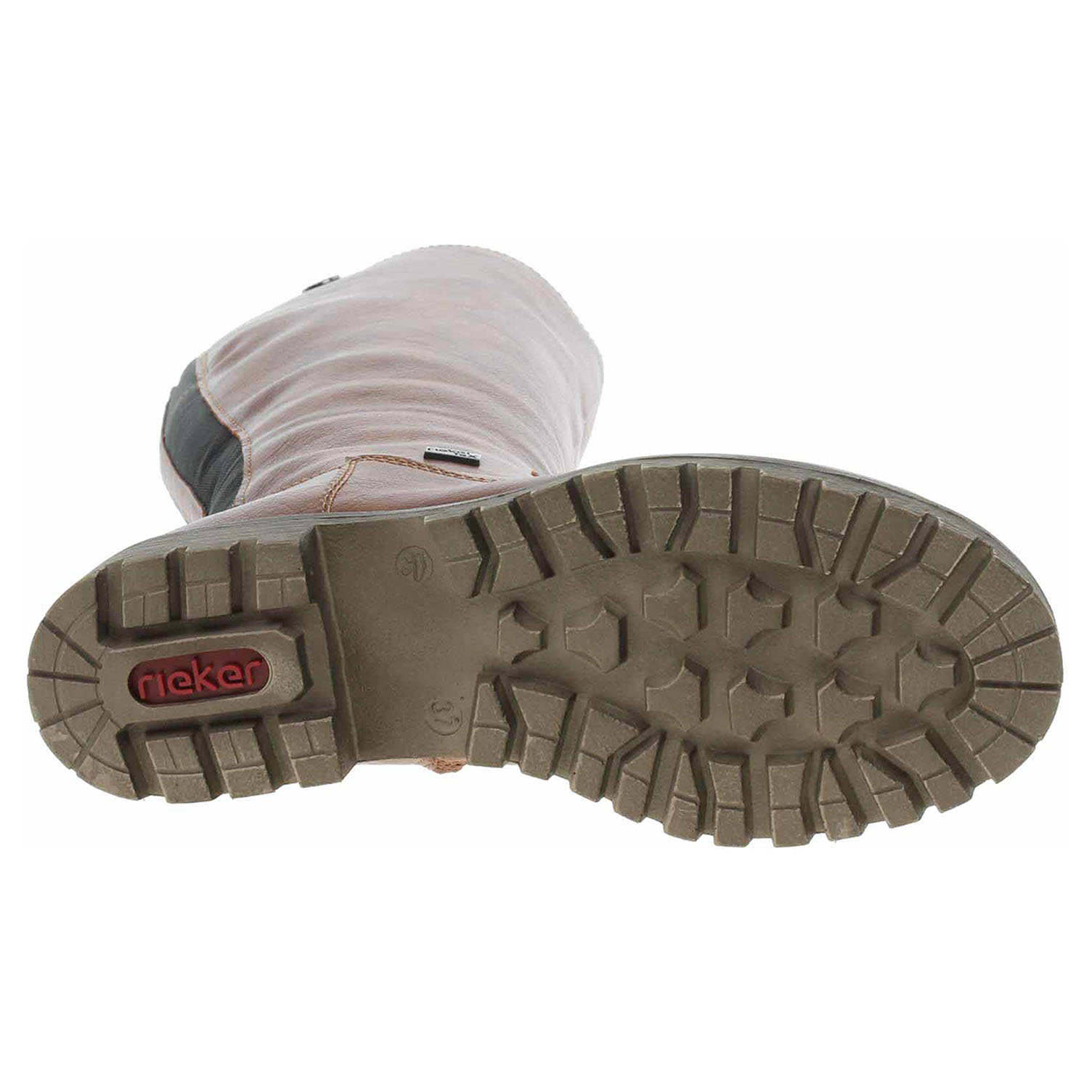 Boty Rieker - lepené dámské kozačky vhodné pro středně široké lýtko velikosti M jsou vybavené vodoodpudivou membránou RiekerTex a na lýtku Vario systémem (vsazenou gumičkou po celé výšce lýtka), který se lépe přizpůsobuje tvaru lýtka a umožňuje částečné zvětšení obvodu. Obuv je vyteplená podšívkou ze 100% ovčí vlny s delším chloupkem. Podpatek je vysoký 3,5 cm a platforma je vysoká 2,- cm. Podešev je flexibilní a díky systému Antistress skvěle tlumí nárazy a otřesy. Lepená obuv - pevnost lepeného spoje může být negativně ovlivněna promáčením nebo propocením, event. opakovaným používáním nedostatečně vysušené obuvi. Při neopatrné chůzi může dojít k mechanickému uvolnění lepeného spoje - ukopnutí.
