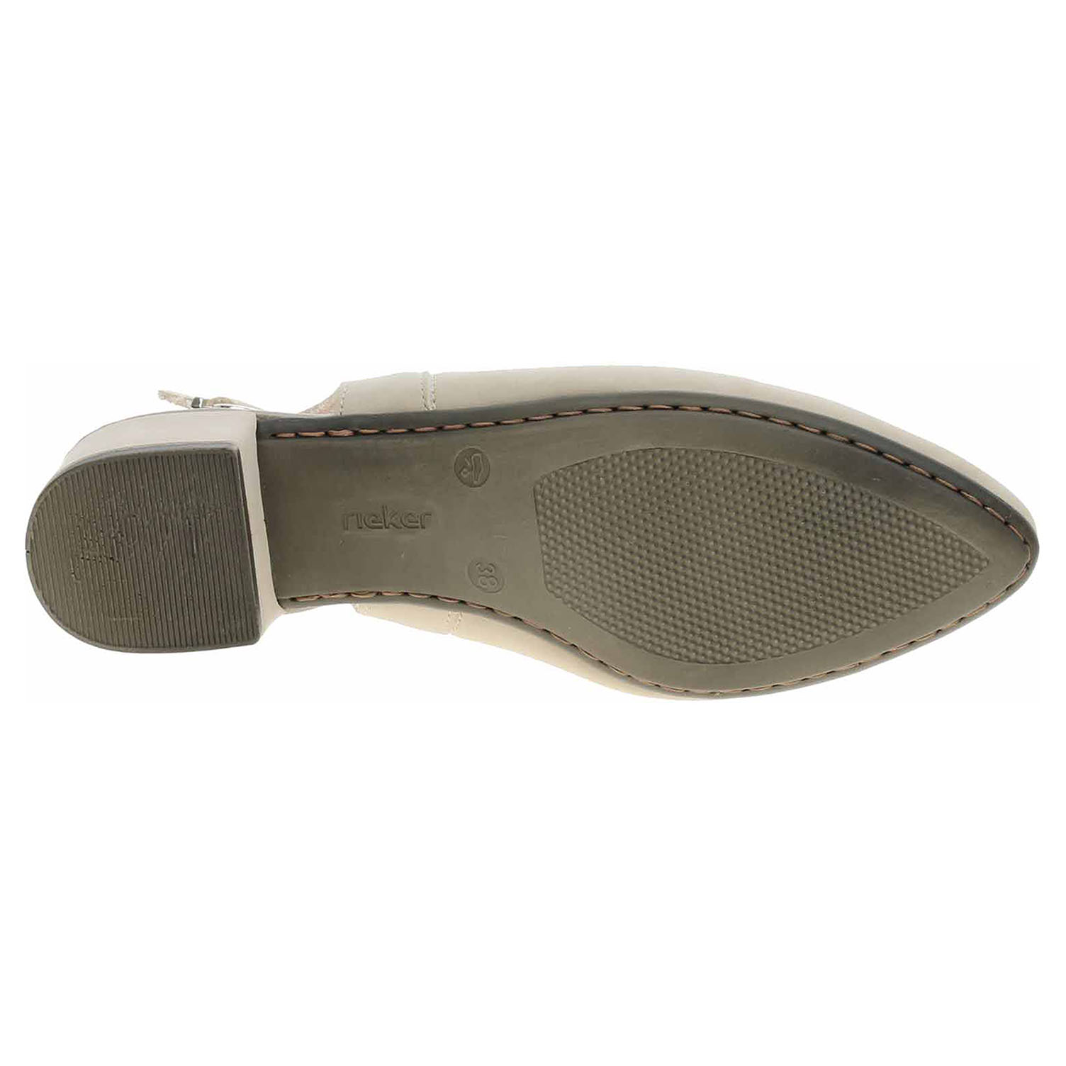 Boty Rieker - flexiblové dámské lodičky se svrškem ze syntetiky, s textilní podšívkou a s vyměkčenou stélkou s nášlapnou vrstvou ze syntetiky mají podpatek vysoký 3,5 cm. Pásek přes patu se zapíná na přezku. Podešev je flexibilní a díky systému Antistress skvěle tlumí nárazy a otřesy. Flexiblová obuv - prošívaná podešev, obuv používejte v suchém prostředí. Při zvýšené vlhkosti může dojít k promáčení obuvi. Obuv pravidelně impregnujte nebo krémujte, zvláště pak prošívaný okraj.