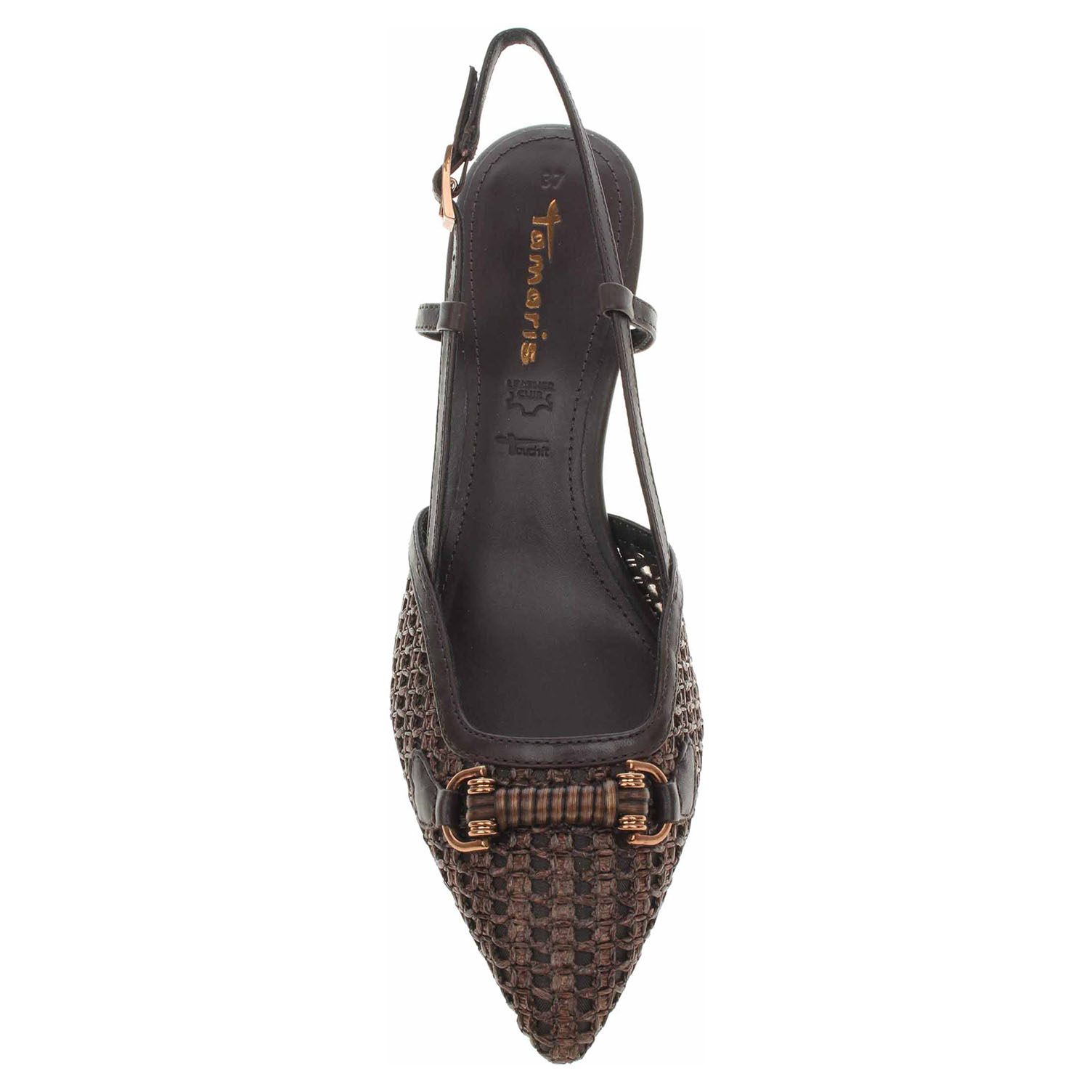 Boty Tamaris - lepené dámské lodičky s volnou patou mají proplétaný svršek kombinovaný useň/textil, podšívku kombinovanou textil/syntetika a stélku kombinovanou useň/syntetika. Paměťová stélka Touch it se přizpůsobuje vašemu chodidlu a zajišťuje při chůzi optimální komfort. Pásek přes patu se všitou gumičkou se zapíná na přezku a poskytuje tak možnost délkové regulace. Podpatek je vysoký 5,5 cm. Lepená obuv - pevnost lepeného spoje může být negativně ovlivněna promáčením nebo propocením, event. opakovaným používáním nedostatečně vysušené obuvi. Při neopatrné chůzi může dojít k mechanickému uvolnění lepeného spoje - ukopnutí.