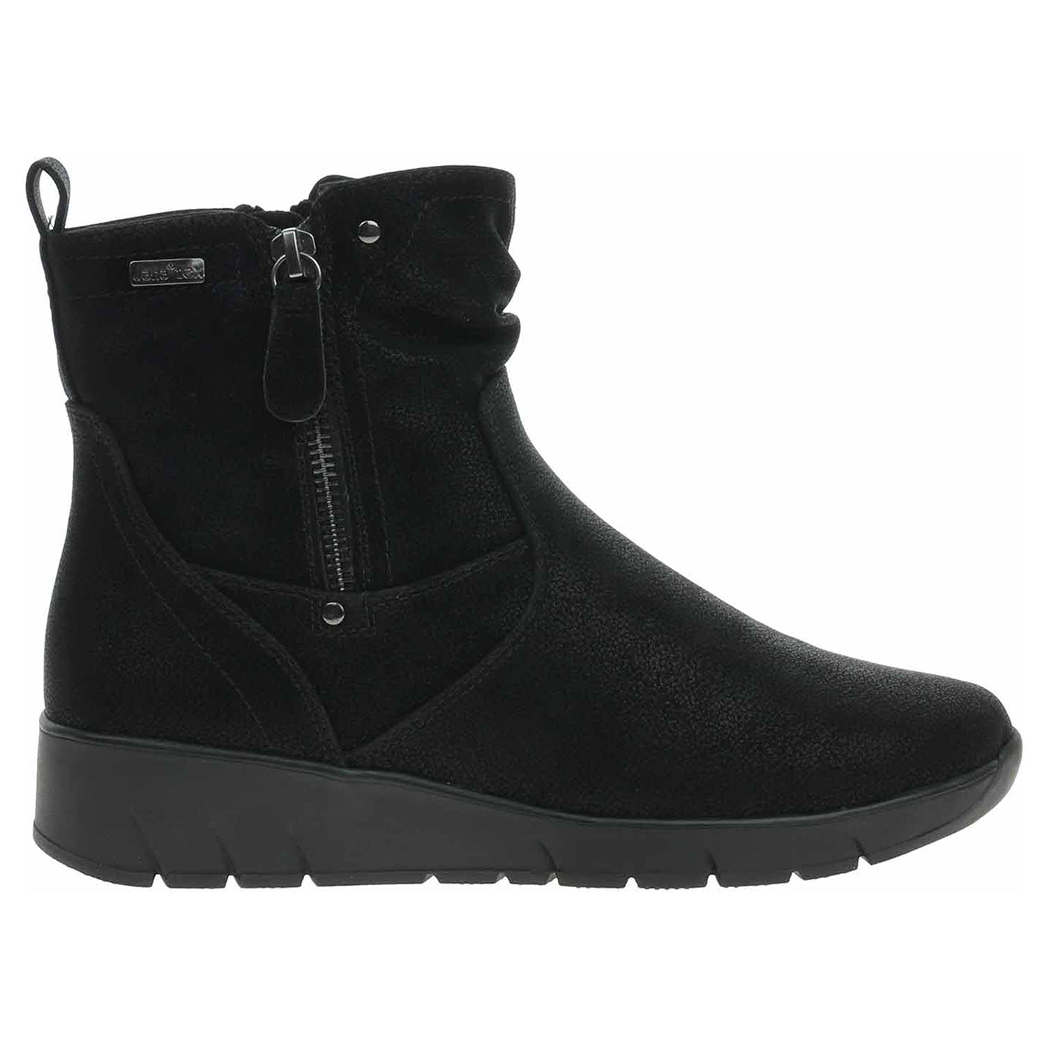 Boty Jana - lepené dámské polokozačky nadměrné šíře H se svrškem ze syntetiky a s textilní stélkou jsou vybavené vodoodpudivou membránou JanaTex. Obuv je vyteplená podšívkou s chlupem. Pohodlné nazouvání zajišťuje zip na vnitřní straně. Zip na vnější straně má pouze ozdobnou funkci. Klínek je vysoký 4,- cm a platforma je vysoká 1,5 cm. Obuv je 100% VEGAN = při výrobě obuvi nebyly použity žádné materiály ze zvířat. Lepená obuv - pevnost lepeného spoje může být negativně ovlivněna promáčením nebo propocením, event. opakovaným používáním nedostatečně vysušené obuvi. Při neopatrné chůzi může dojít k mechanickému uvolnění lepeného spoje - ukopnutí.