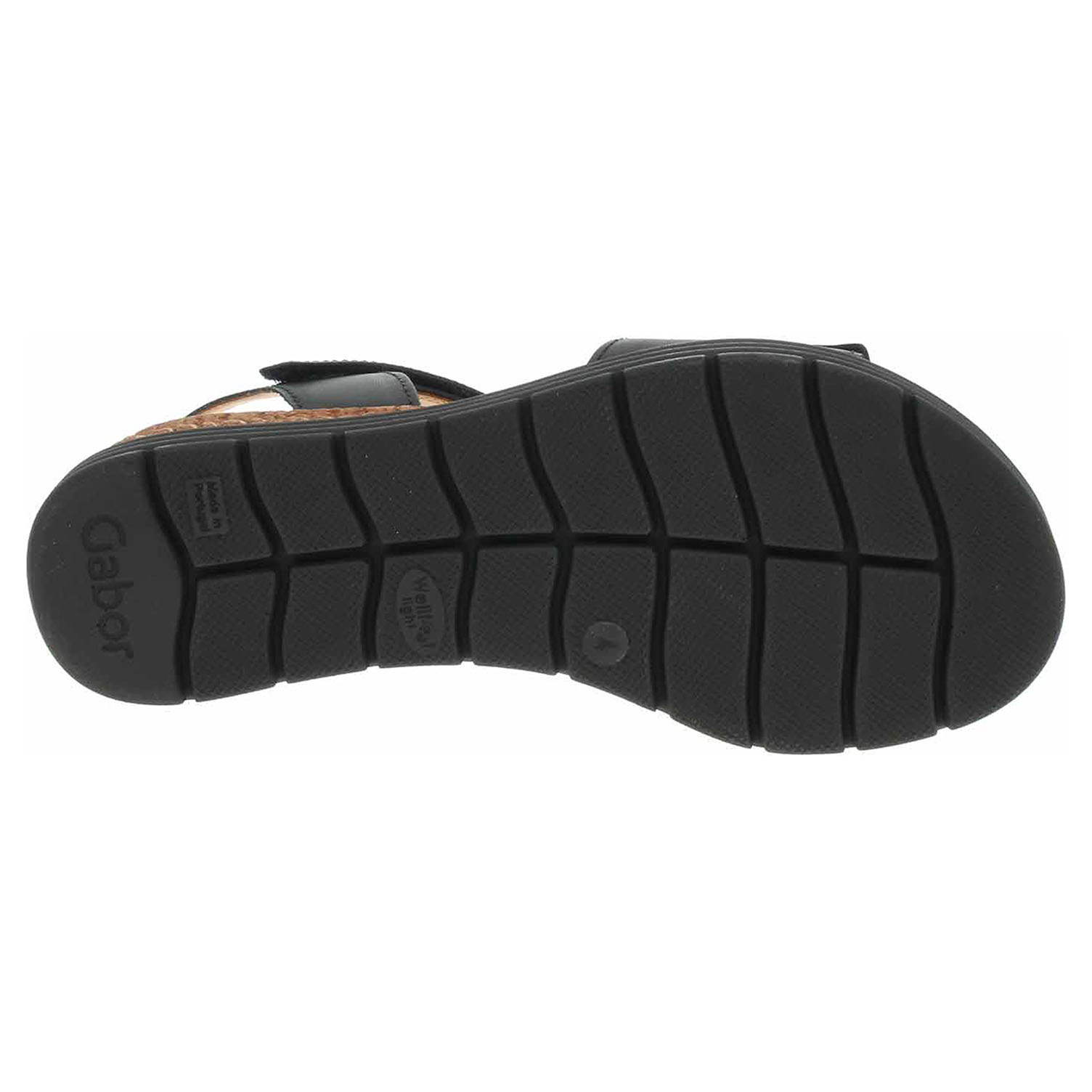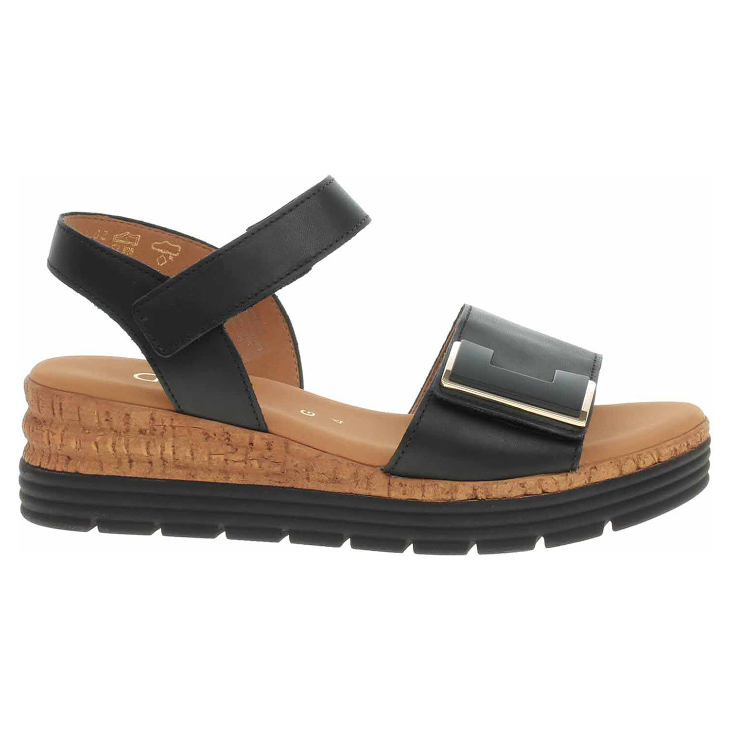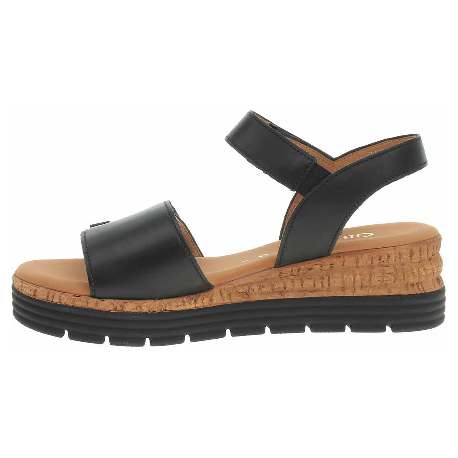 Boty Gabor - dámské sandály se svrškem z usně a s textilní podšívkou jsou vybavené vyměkčenou stélkou z usně. Gabor obuv šířky G (větší šířka) - to znamená, že tato obuv poskytuje více prostoru pro prsty, bříška palců a oblast nártu a tím i více nezbytného pohodlí. Pásky přes špičku a kotník se zapínají na suchý zip. Klínek je vysoký 5,- cm a platforma je vysoká 2,5 cm.