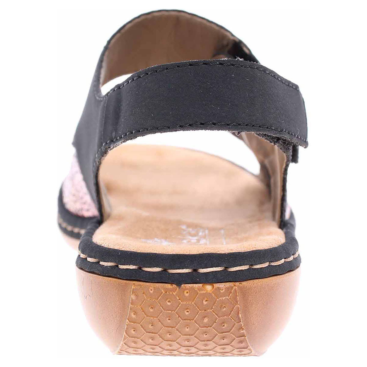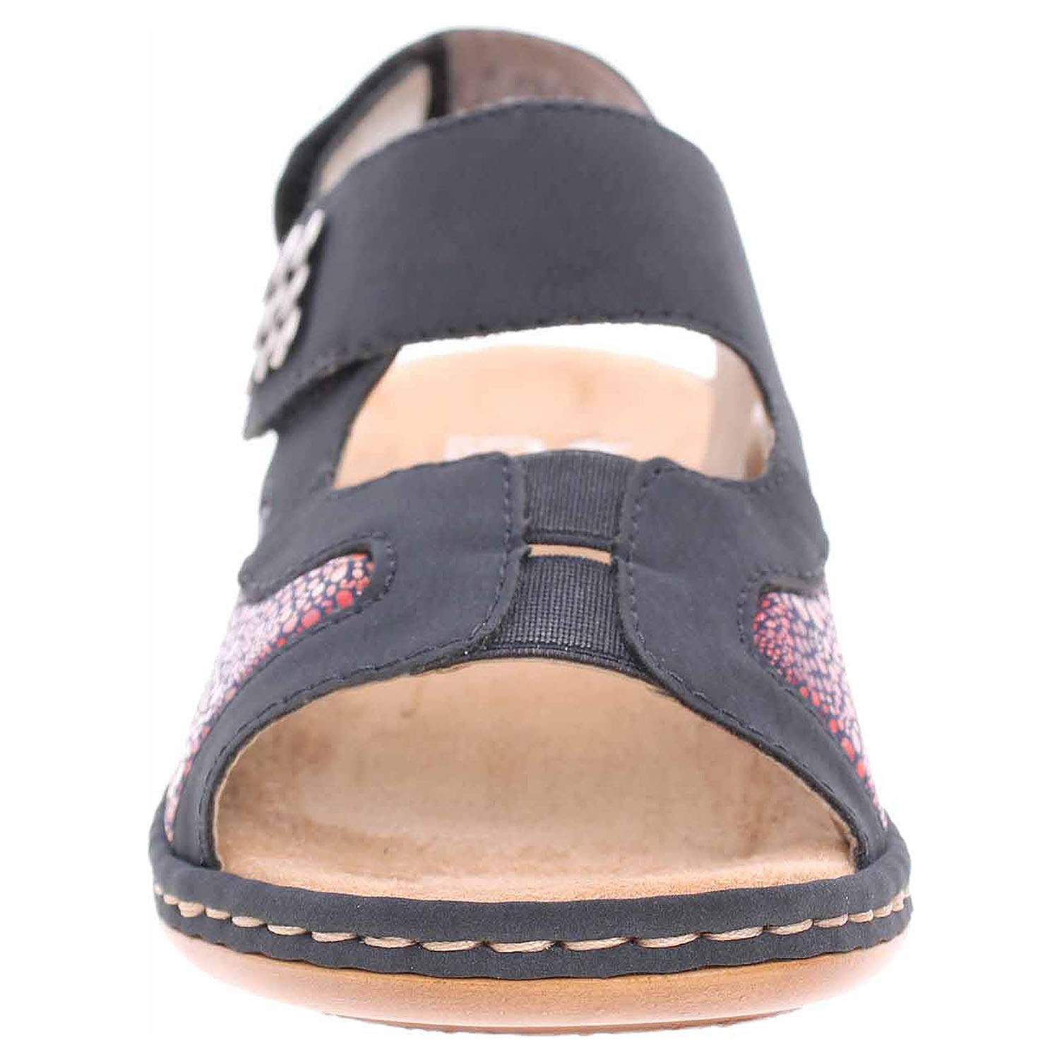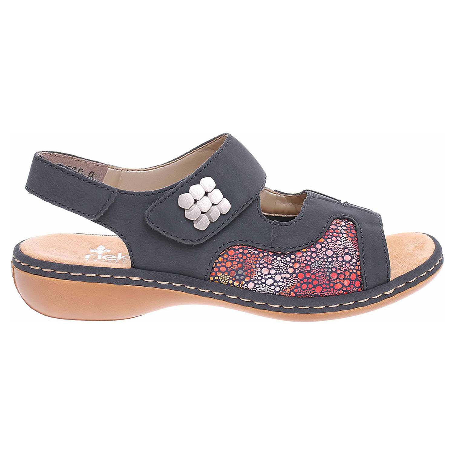 Boty Rieker - dámské sandály se svrškem i podšívkou ze syntetiky a s textilní stélkou mají klínek vysoký 3,- cm. Obuv je na špičce vybavená vsazenými gumičkami, které umožňují částečné zvětšení objemu. Pásky přes nárt i přes patu se zapínají na suchý zip. Podešev je flexibilní a díky systému Antistress (lehkost, pružnost, prostornost a vynikající absorpce nárazů) Vám obuv zajistí pohodlí při každém kroku.