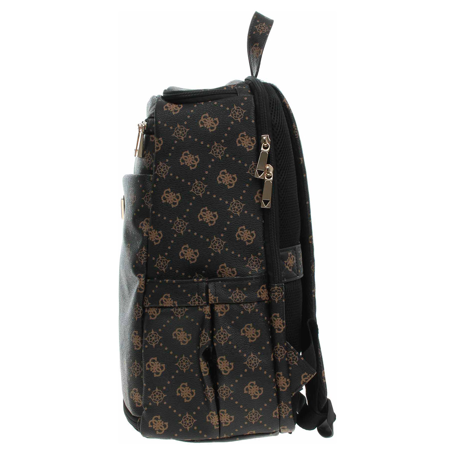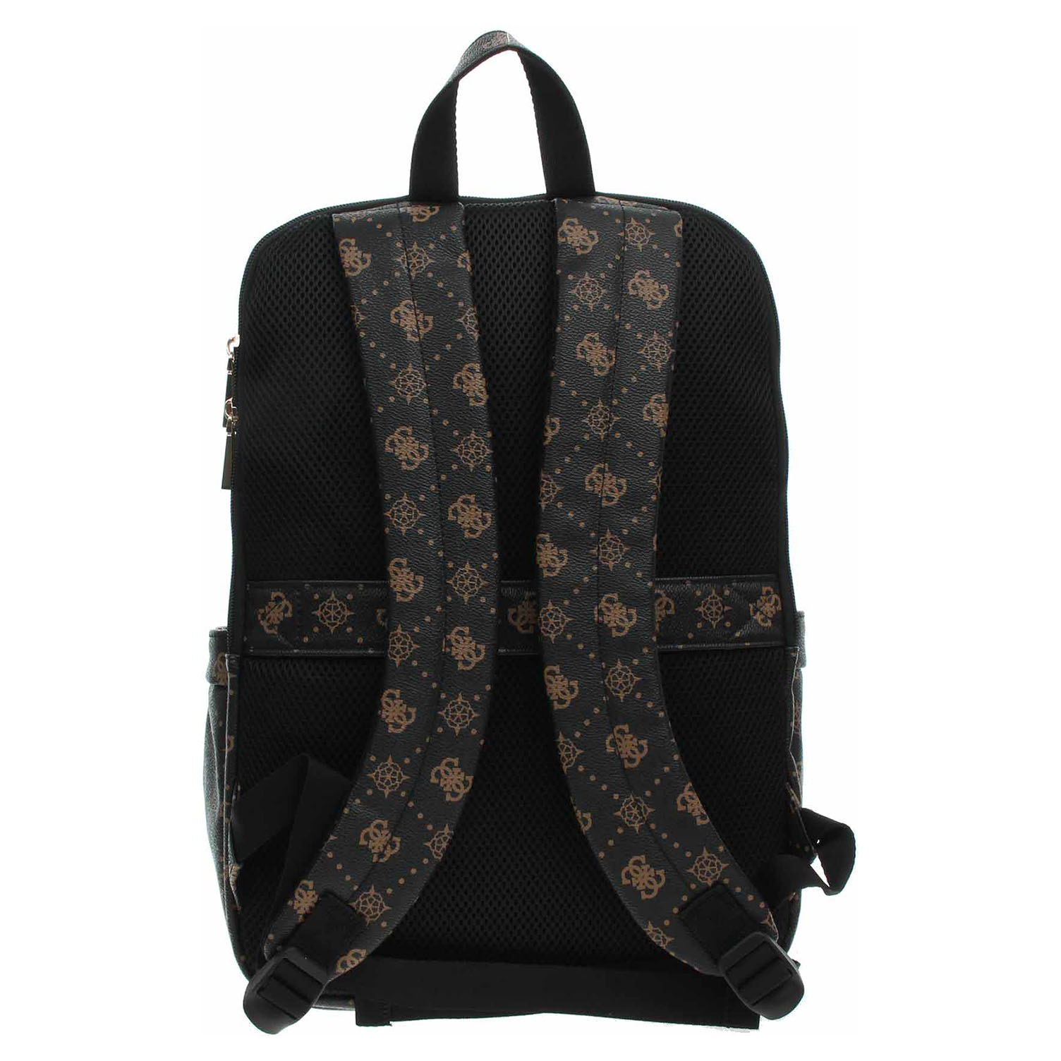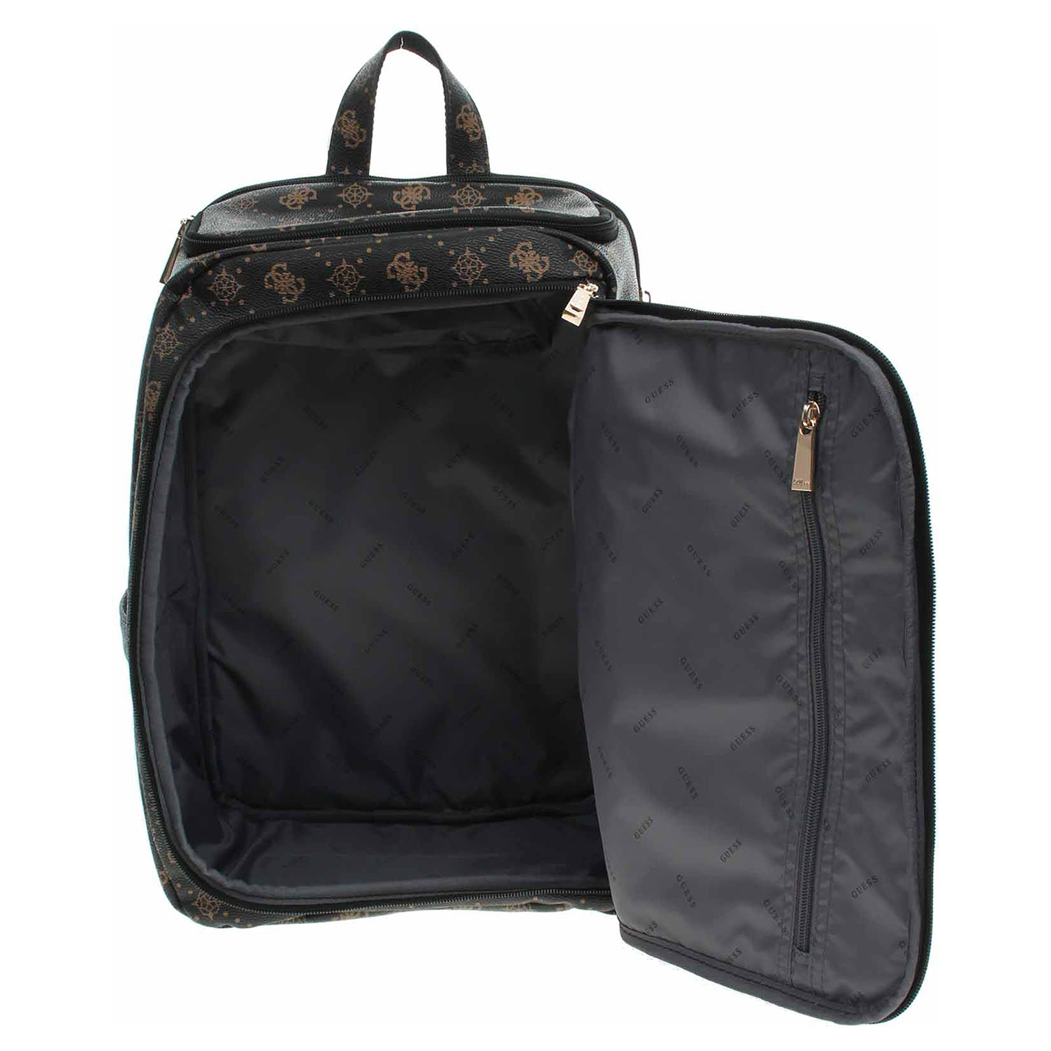 Guess - cestovní batoh s celoplošným potiskem 4G a motivu pivoňky a s logem v trojúhelníku na přední straně se zapíná na dvocestný zip a je vyrobený ze 100% polyuretanu s podšívkou ze 100% polyesteru. Hlavní komora se otevírá zipem na přední straně, kde se nachází velká kapsa se zipem. Na horní části batohu je kapsa se zipem, která je uvnitř vybavená kapsou se zipem. Na zádech, která jsou polstovaná a vzdušná, je další velká kapsa na notebook se zapínáním na zip. Na bocích jsou pohotovostní kapsy. Batoh je možno nosit v ruce za ucho nebo na remenou na regulovatelných popruzích. Batoh je vybaven zadním popruhem pro snadné připevnění batohu na vozík. Rozměry: 29 x 42 x 24 cm cm.