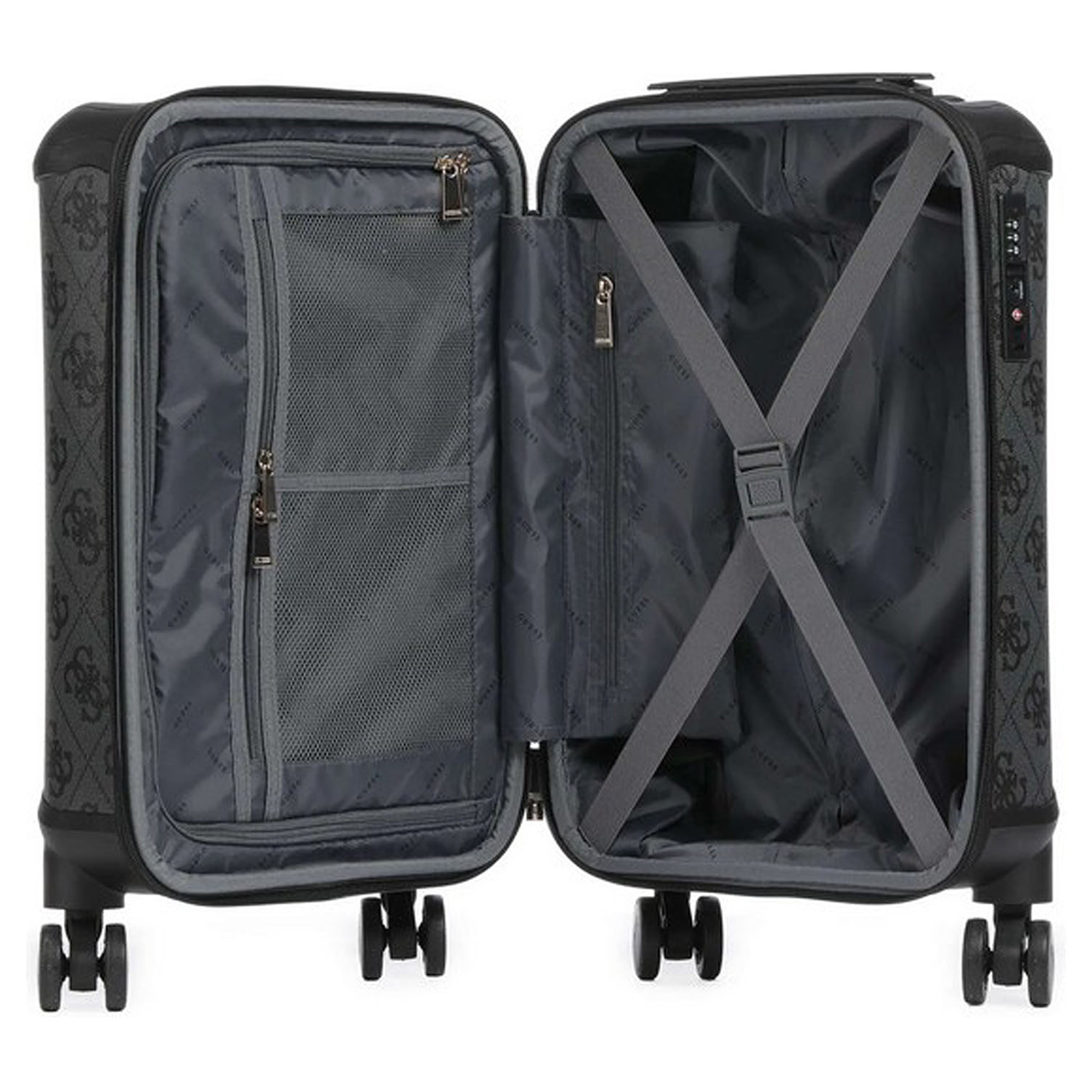Guess - cestovní kufr ze syntetiky s rozměry 32 x 53 x 22 cm se zavírá dvoucestným zipem (uzamykatelný uzávěr pro lepší ochranu před krádeží). Držadla na horní straně. Pohodlnou manipulaci zajišťuje držadlo a výsuvná konstrukce se dvěmi rameny a sada koleček (4 spinnery - nehlučná kolečka). TSA zámek s číselnou kombinací - usnadňuje kontrolu zavazadel v USA. Součástí je odnímatelný přívěsek (jmenovka s adresou). vnitřní výbava: podšívka z polyesteru s logem, křížové popruhy k upevnění obsahu proti pomačkání, organizér, dělicí stěna, dvě přihrádky na zip. Hmotnost: 3 kg. Volum: 32 L.