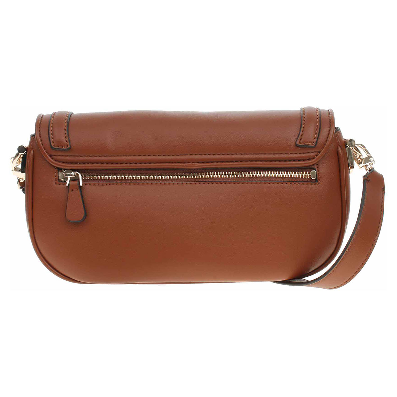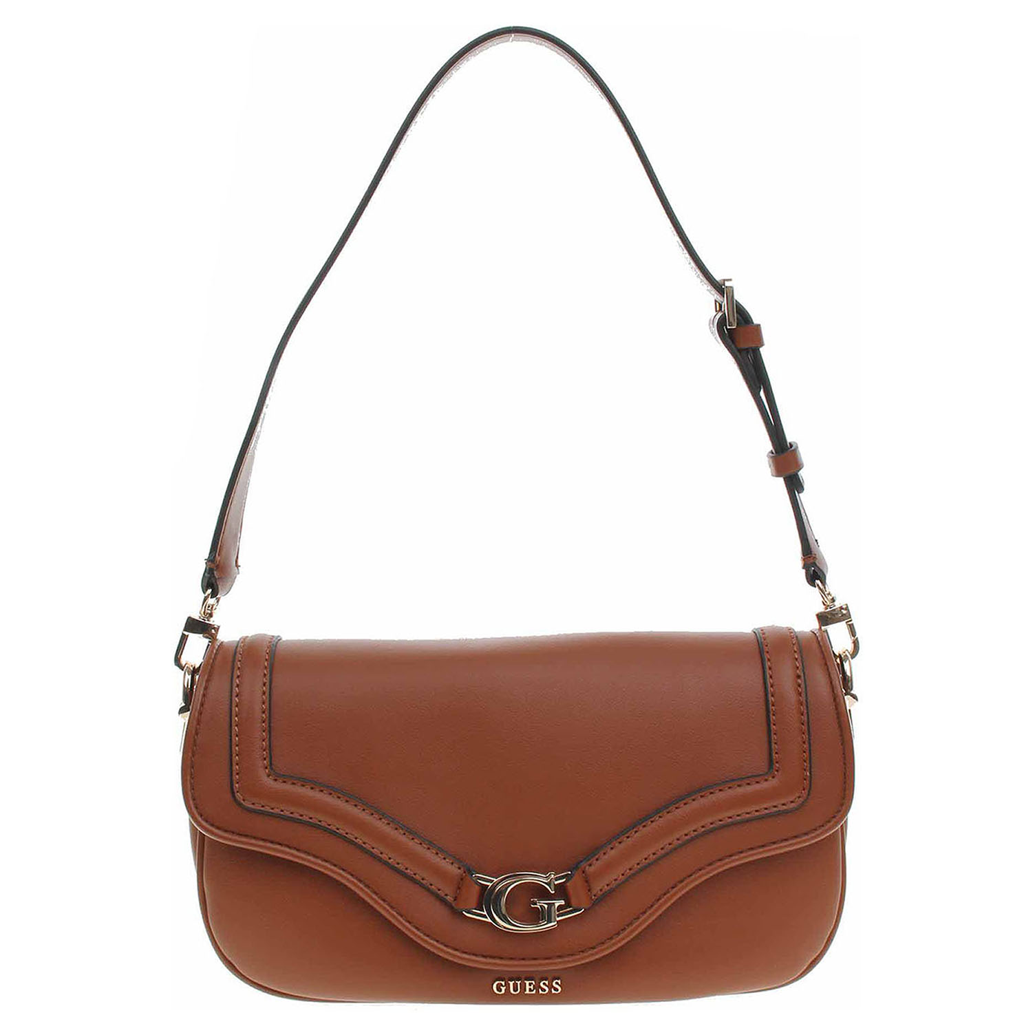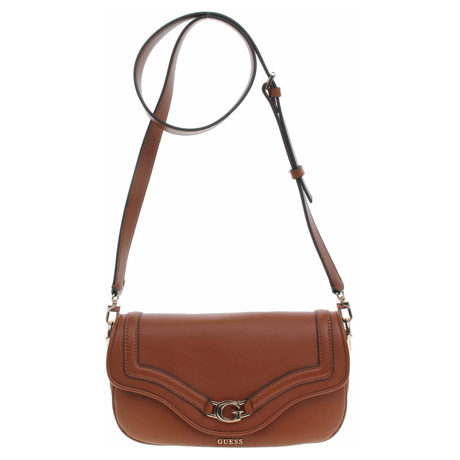 Guess - dámská klopnová kabelka Dea ze 100% polyuretanu a s podšívkou s personalizovaným logem z polyesteru se zapíná na dva magnety. Klopna je ozdobená zlatým logem. Zipy, kování, karabinky a nožičky jsou ve zlaté barvě. Kabelku s rozměry 29 x 15 x 6 cm je možno nosit přes rameno na odnímatelném regulovatelném popruhu (délka 110-130 cm) nebo jen v ruce za odepínatelný, kratší popruh (max délka cca 60 cm). Na zadní straně je kapsa se zipem a pod klopnou na přední straně je kapsa bez zapínání. Vnitřní výbava: v hlavní komoře je kapsa se zipem + 6x přihrádka na karty. Údržba: Neprat. Skladujte v dodaném protiprachovém sáčku.