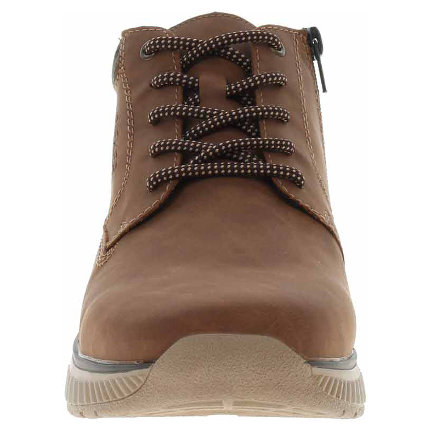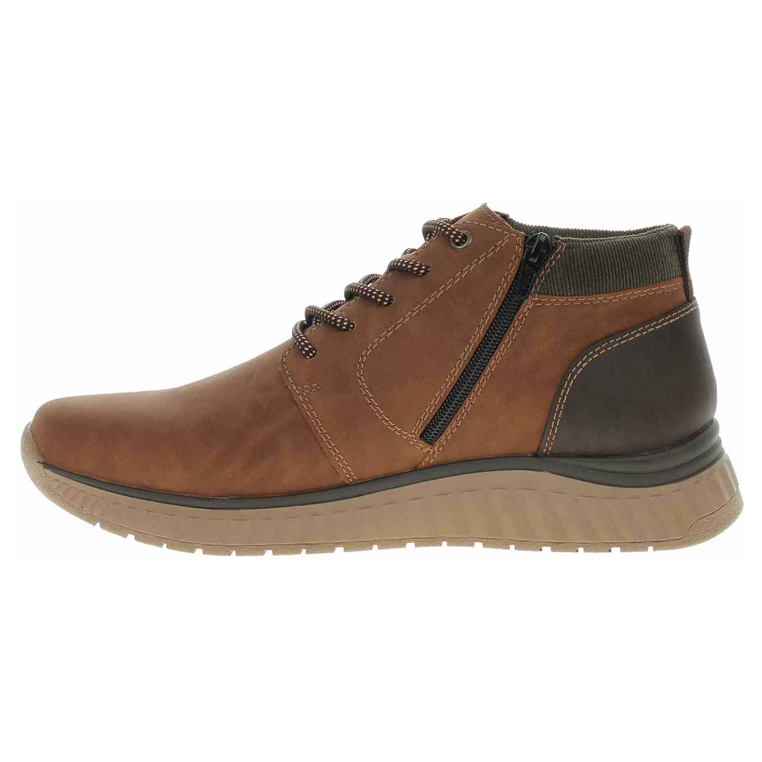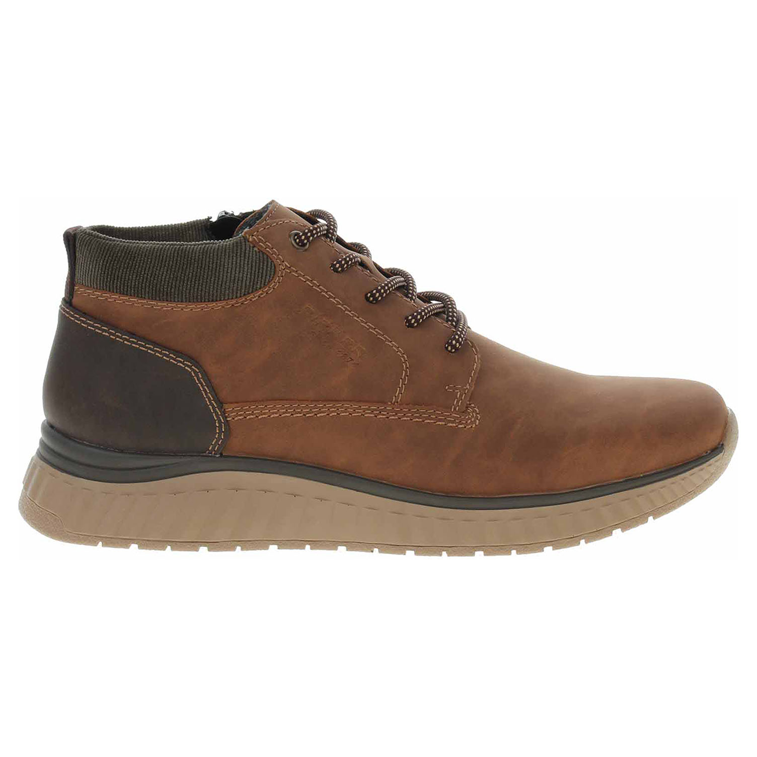 Boty Rieker - lepená pánská kotníková obuv se svrškem ze syntetiky a s textilním lemem kolem kotníku je vyteplená textilní podšívkou a je vybavená vyndavací, paměťovou stélkou MemoSoft, která maximálně změkčuje došlap a zvyšuje pohodlí v obuvi. Vyměnitelné vložky do bot je možné vyndat za účelem provětrání a omytí. Značnou výhodu nabízejí vyměnitelné vložky do bot také těm uživatelům, kteří používají ortopedické vkládací stélky. Pohodlné nazouvání zajišťuje šněrování a zip na vnitřní straně. Klínek je vysoký 4,- cm. Podešev je flexibilní a díky systému Antistress skvěle tlumí nárazy a otřesy. Lepená obuv - pevnost lepeného spoje může být negativně ovlivněna promáčením nebo propocením, event. opakovaným používáním nedostatečně vysušené obuvi. Při neopatrné chůzi může dojít k mechanickému uvolnění lepeného spoje - ukopnutí.
