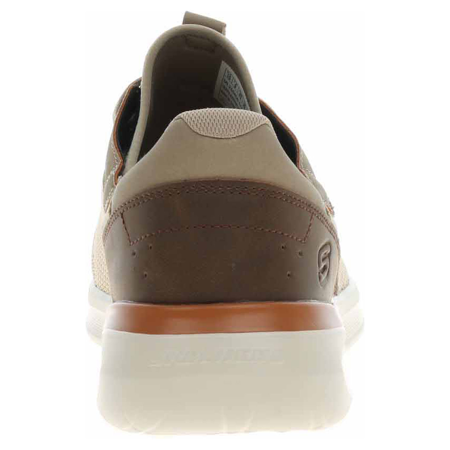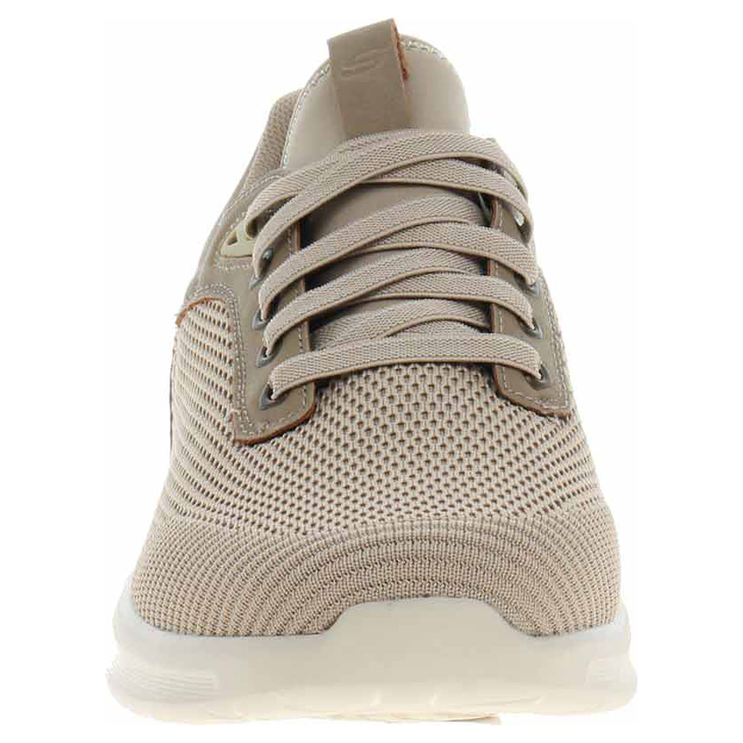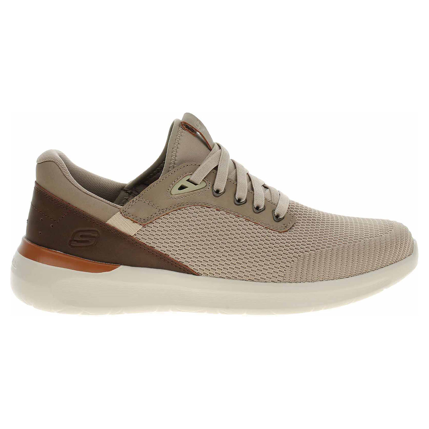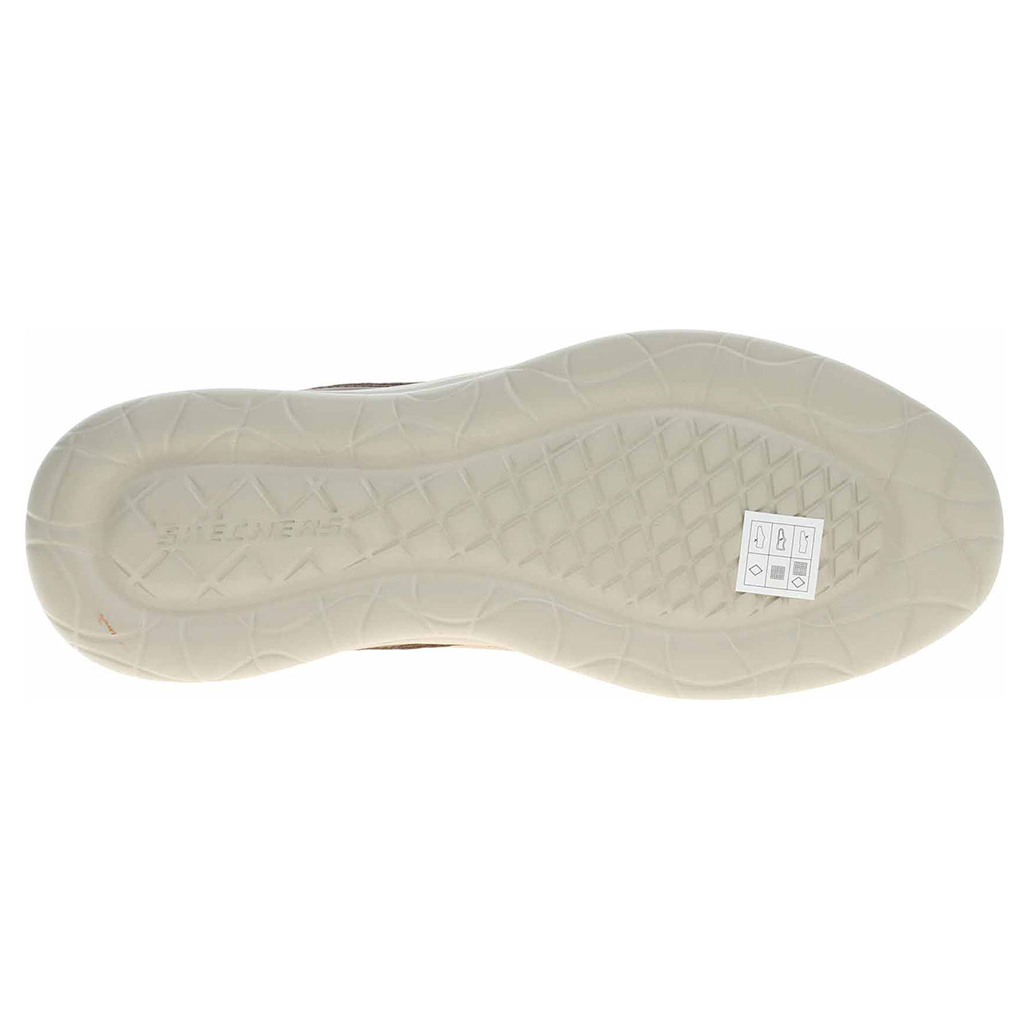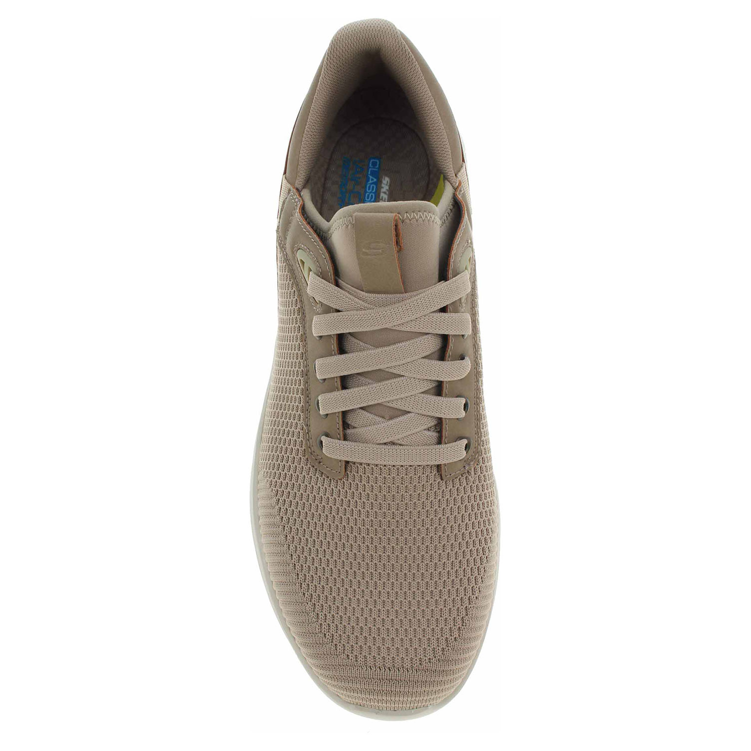 Boty Skechers - rekreační pánská vycházková obuv se svrškem kombinovaným textil/syntetika je vybavená paměťovou stélkou Air-Cooled Memory Foam s klenbou GogaMat Arch = podiatristy certifikovaná podpora klenby. Měkkoučká stélka z Air-Cooled Memory Foam (vzduchem chlazená pamět.pěna) zajištuje chůzi jak na polštáři, ale noha se nepřehřívá a přirozeně se ochlazuje. Obuv je prozouvací a šněrováním je provlečená nekonečná gumička. Klínek je vysoký 3,5 cm. Obuv je 100% VEGAN = při výrobě obuvi nebyly použity žádné materiály ze zvířat. Rekreační obuv - je vhodná pro rekreačně-vycházkové příležitosti. Není určená k provozování sportovních aktivit.Obuv není vhodná pro každodenní používání.