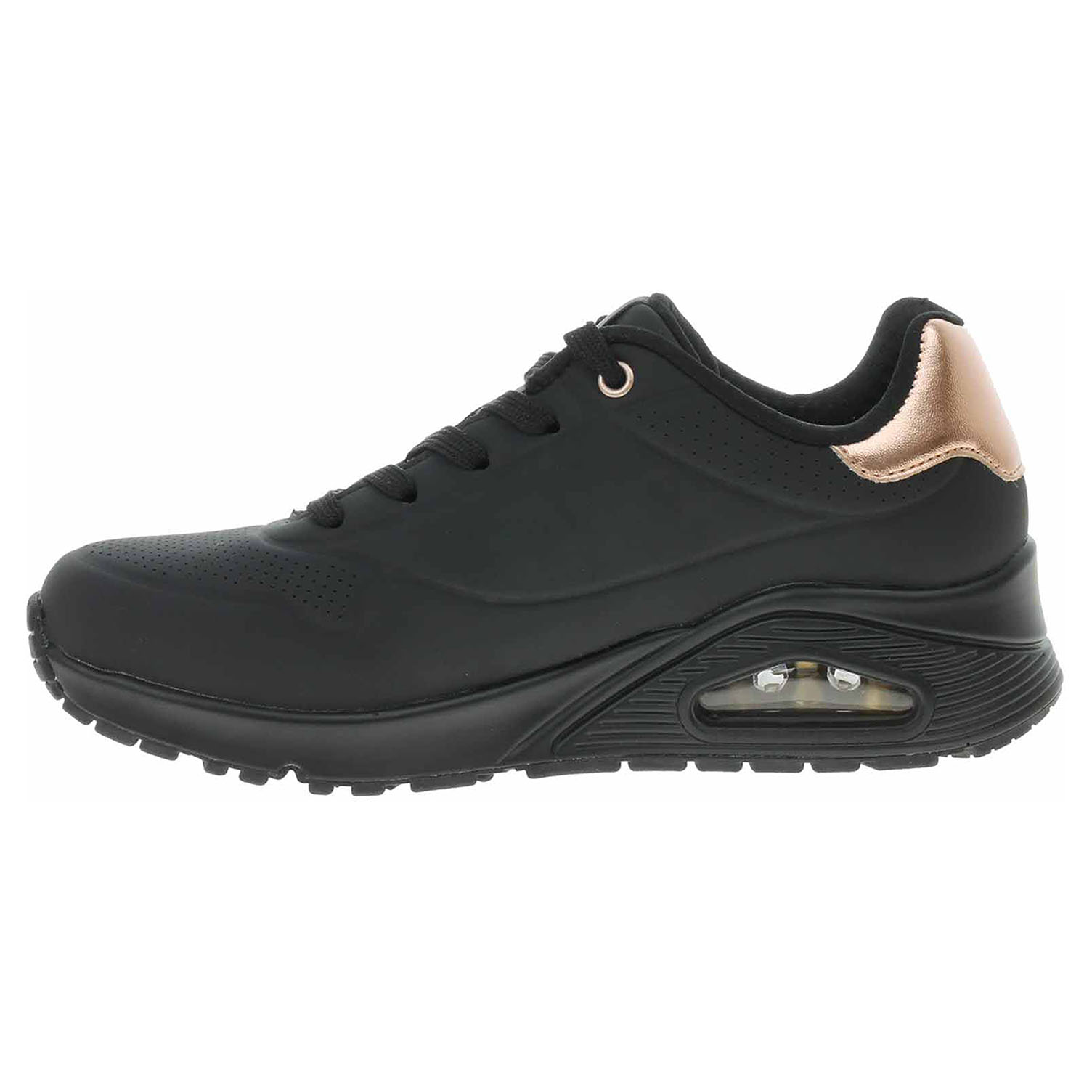 Boty Skechers Uno - Golden Air - lepená dámská vycházková obuv se šněrováním má svršek ze syntetického materiálu durabuck se zlatými prvky a je vybavená paměťovou stélkou Air-Cooled Memory Foam® (vzduchem chlazená pamět.pěna), která zajištuje chůzi jak na polštáři, ale noha se nepřehřívá a přirozeně se ochlazuje. Klínek s viditelnou odpruženou mezipodešví Skech-Air® se vzduchovým polstrováním je vysoký 4,- cm. Lepená obuv - pevnost lepeného spoje může být negativně ovlivněna promáčením nebo propocením, event. opakovaným používáním nedostatečně vysušené obuvi. Při neopatrné chůzi může dojít k mechanickému uvolnění lepeného spoje - ukopnutí.
