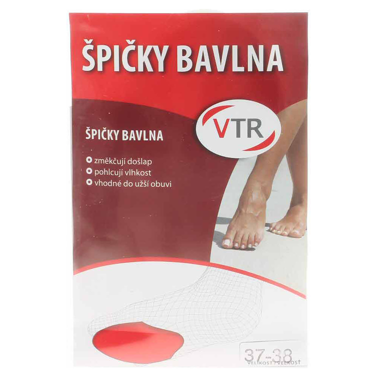 VTR špičky bavlna - špičky na latexové pěně s prodyšnou bavlněnou tkaninou tlumí otřesy při chůzi, změkčují došlap. Díky samolepící fólii brání posunu v obuvi. Doporučujeme při vyšší zátěži nohou, nebo v případě nerovností v obuvi.