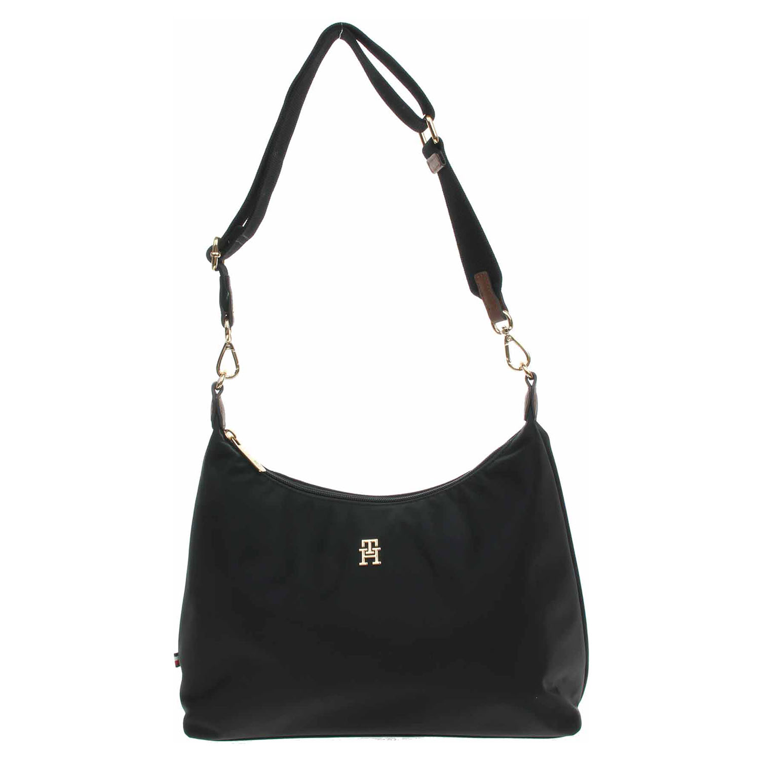 Tommy Hilfiger - dámská kabelka s luxusní plaketou s monogramem TH na přední straně se zapíná na zip a je vyrobená ze 100% nylonu. Kabelku je možno nosit přes rameno na regulovatelném popruhu, který se dá odepnout. Rozměry: 34 x 11 x 29 cm (objem 6 l). Karabinky, kroužky, zip i logo jsou z leštěného kovu zlaté barvy. Vnitřní výbava: 1x kapsa se zipem, 2x kapsička bez zapínání.