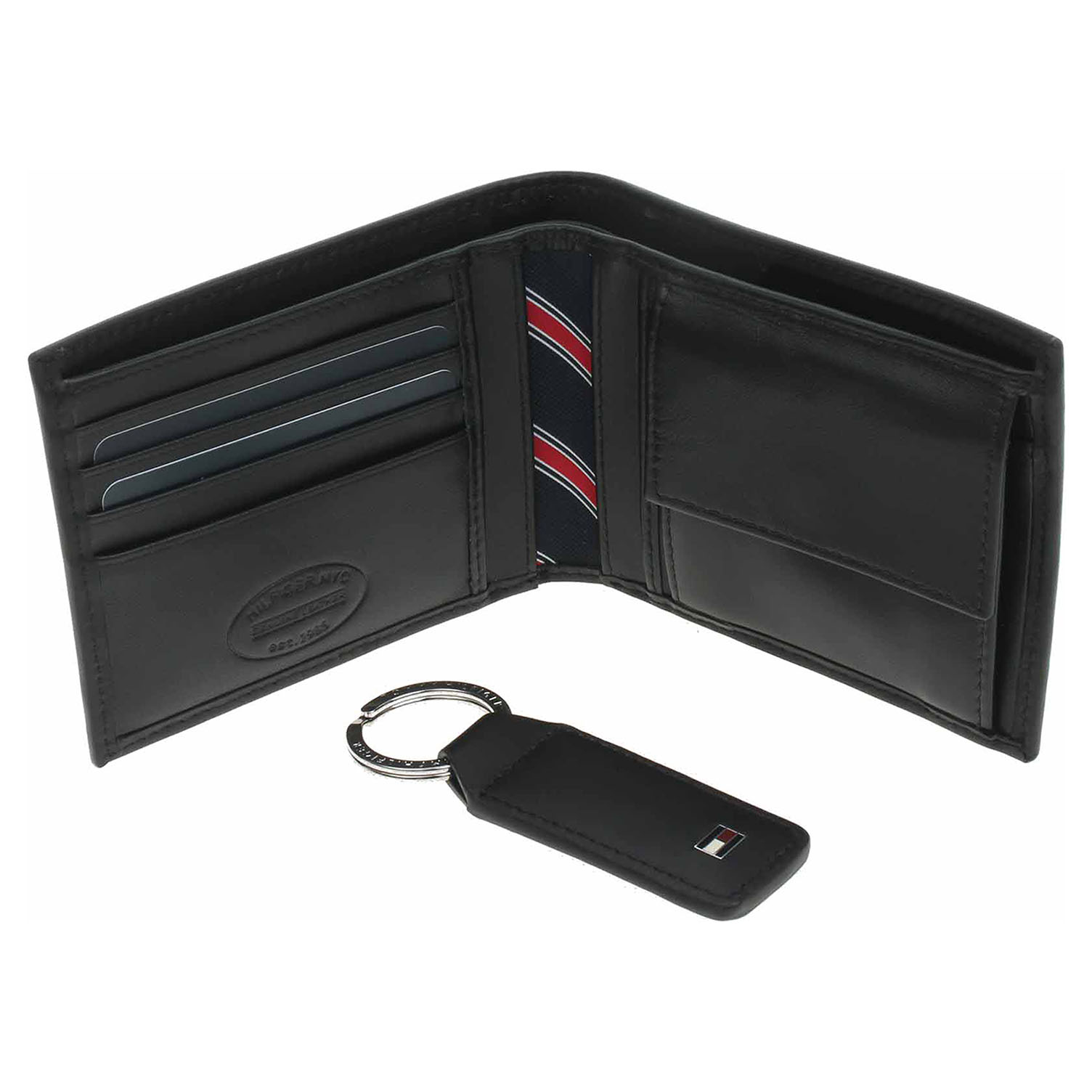 Tommy Hilfiger - pánská rozkládací peněženka z hovězí usně lícové + přívěšek na klíče. Peněženka je vybavená přihrádkami na bankovky, na karty a kapsičkou na drobné se zapínáním na patent. Rozměry peněženky: 13 x 9 x 2 cm. Dárkové balení v originální krabičce.